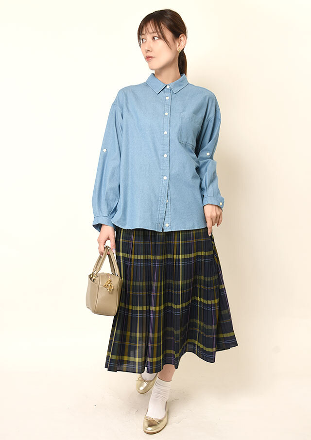 ブルー系の色味が爽やかなので、白やベージュのボトムと合わせると、清潔感のあるスタイルが完成します。