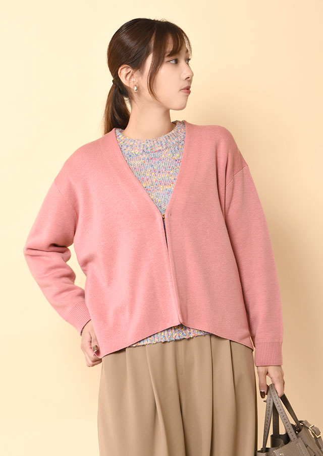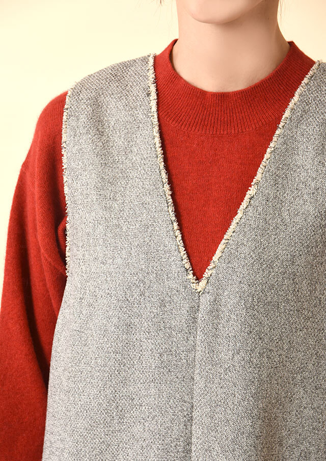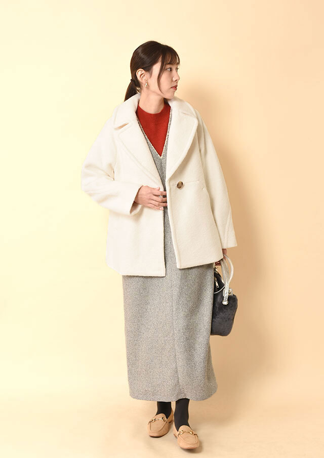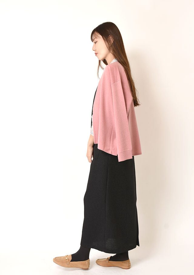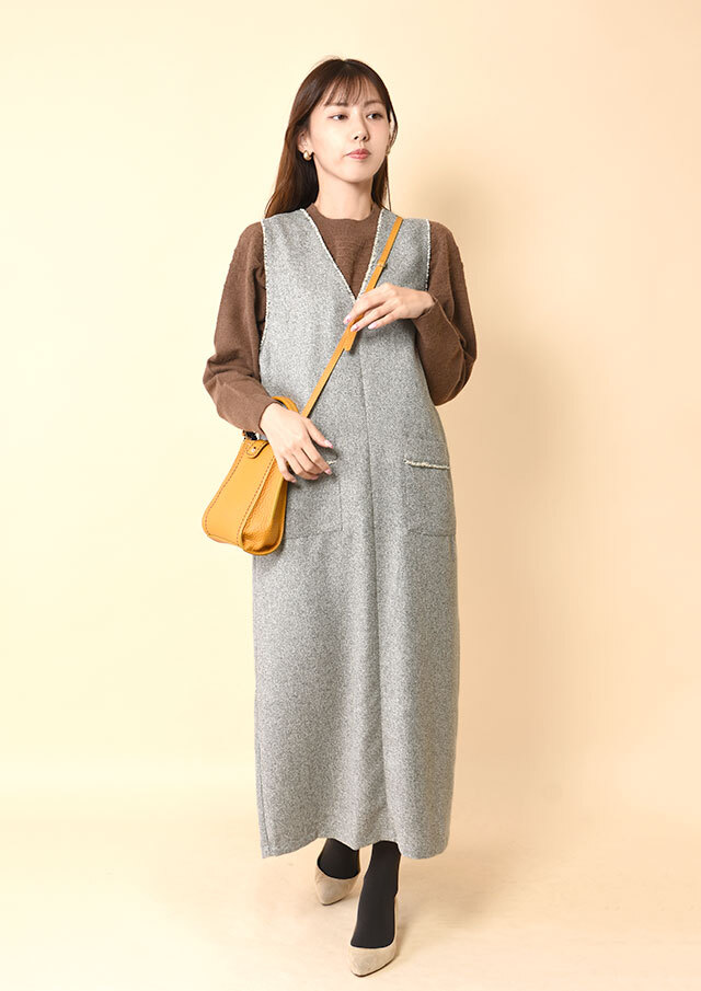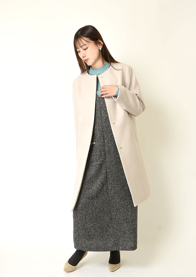 Vネックを前にすれば、インナーの表情がスッキリと映え、縦長のシルエットが上品に整います。