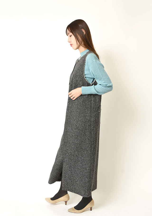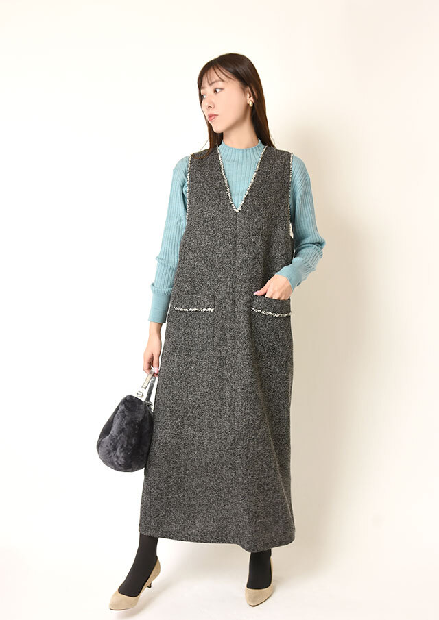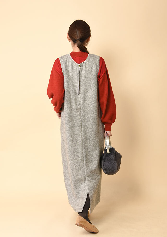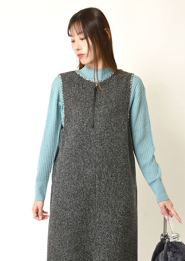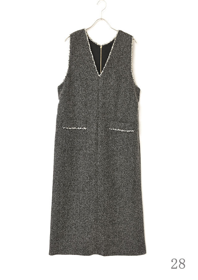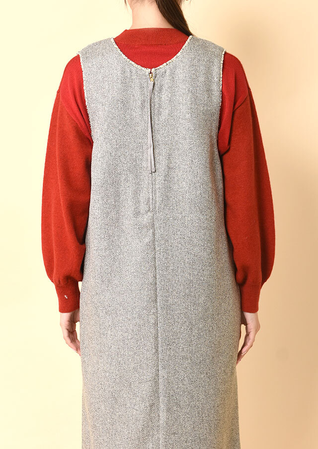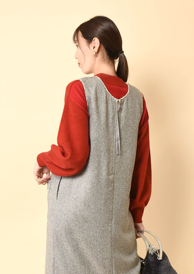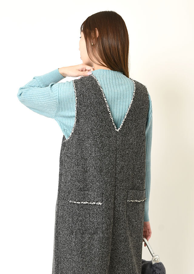 前後で異なるネックラインを楽しめるツイードのジャンパースカートです。