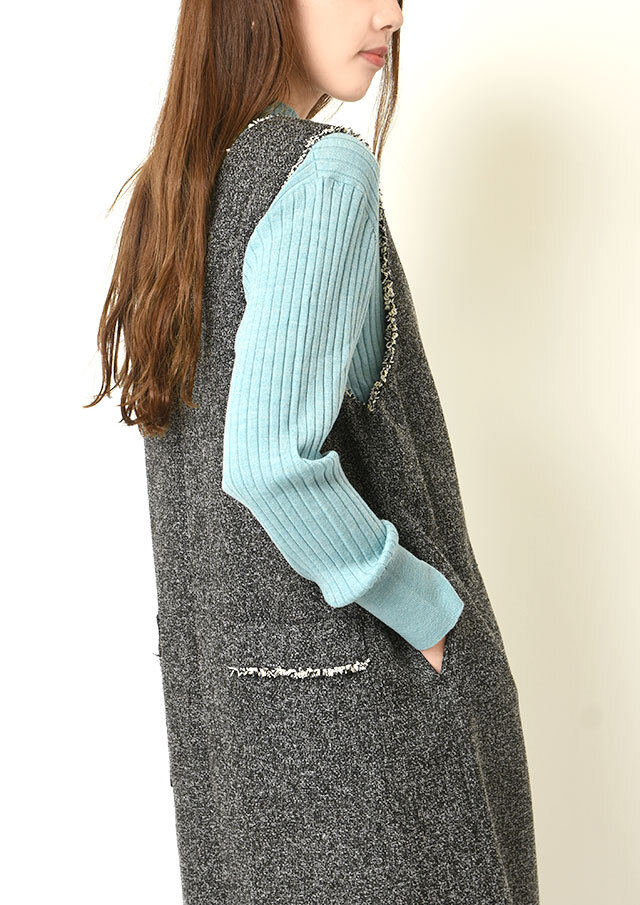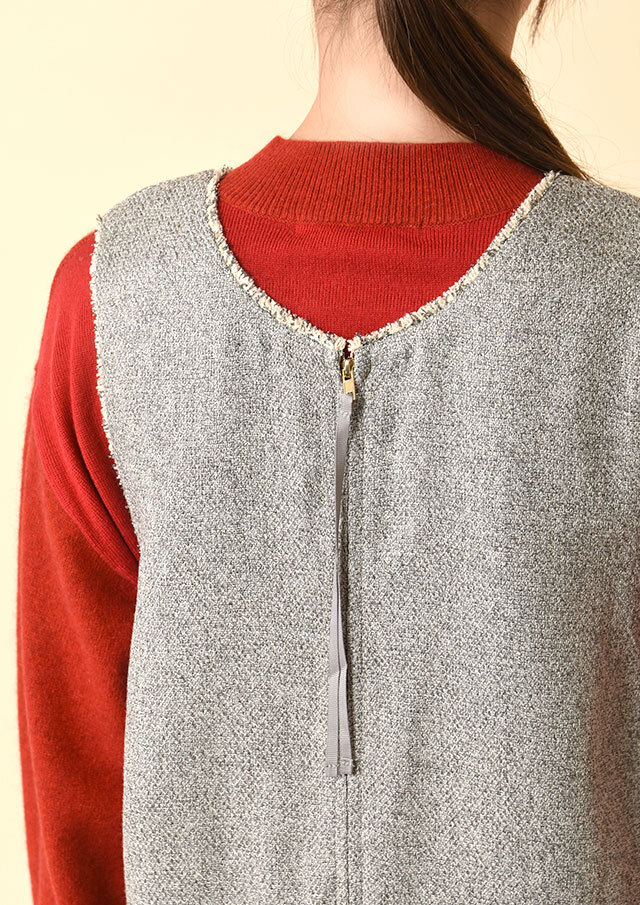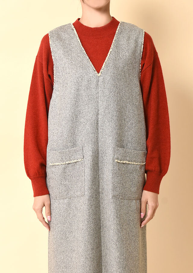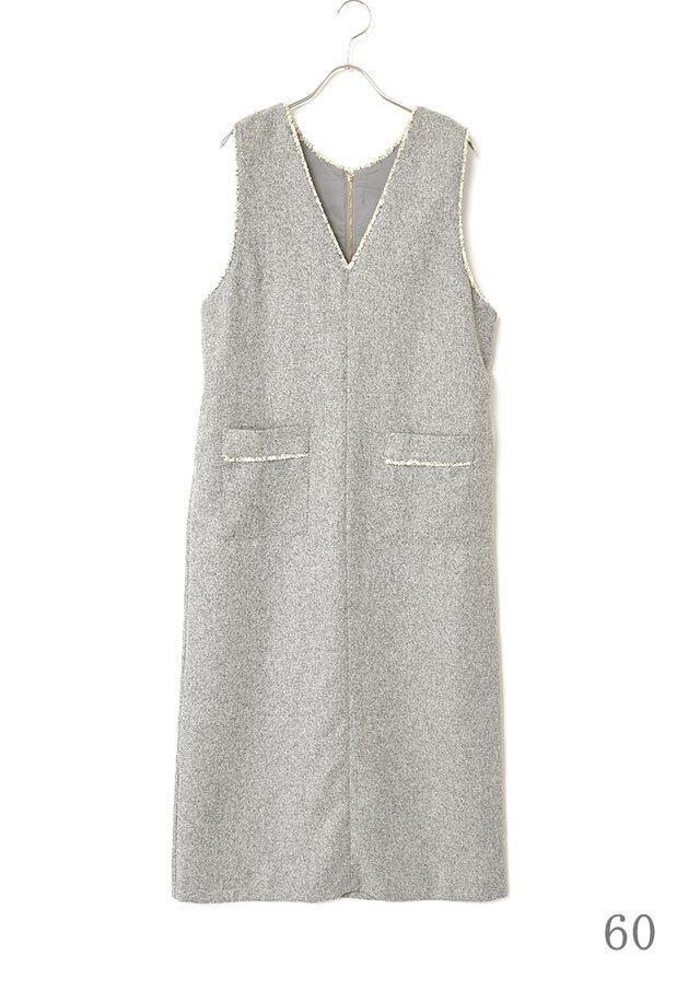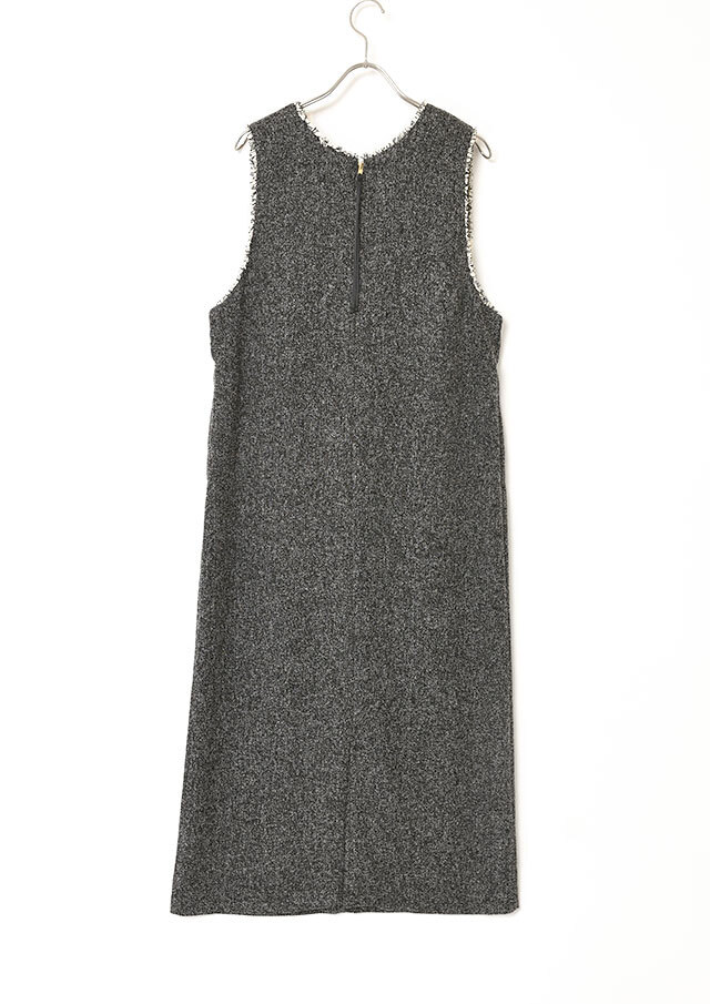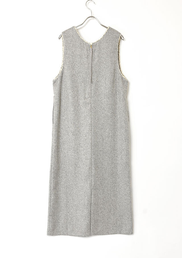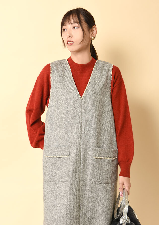 前後で異なるネックラインを楽しめるツイードのジャンパースカートです。