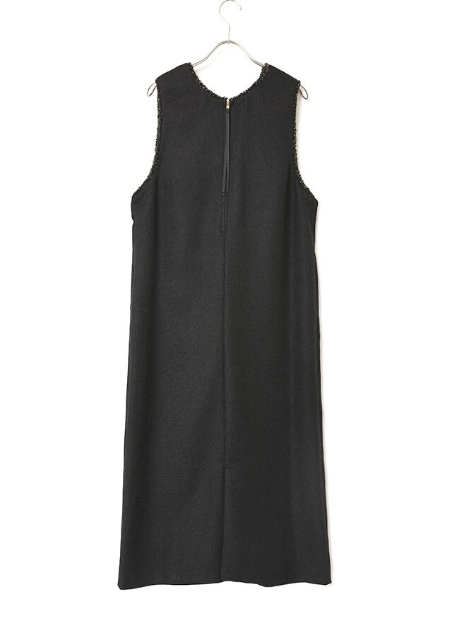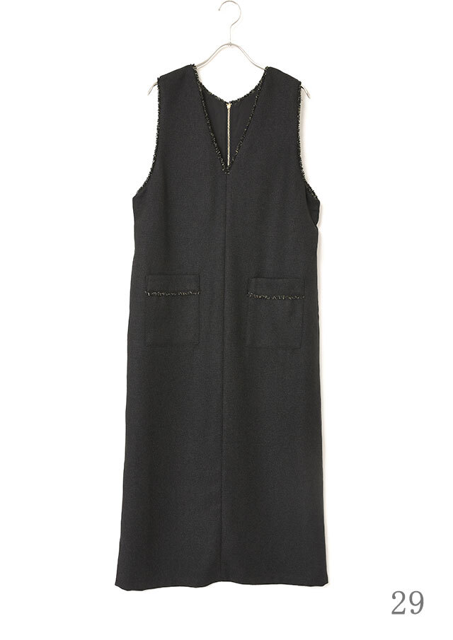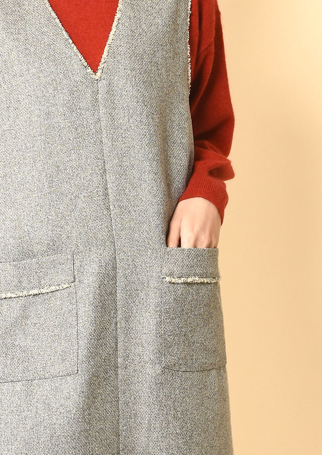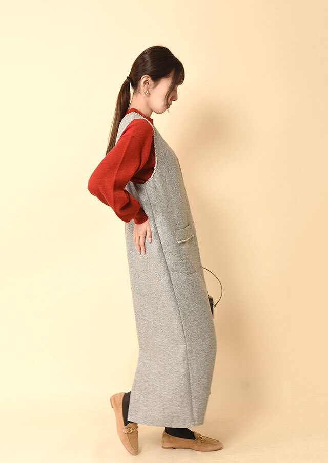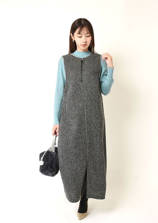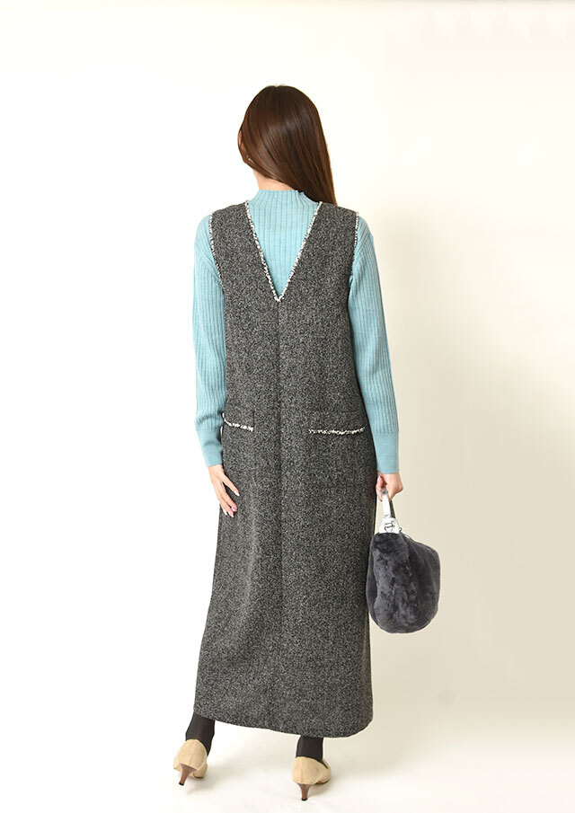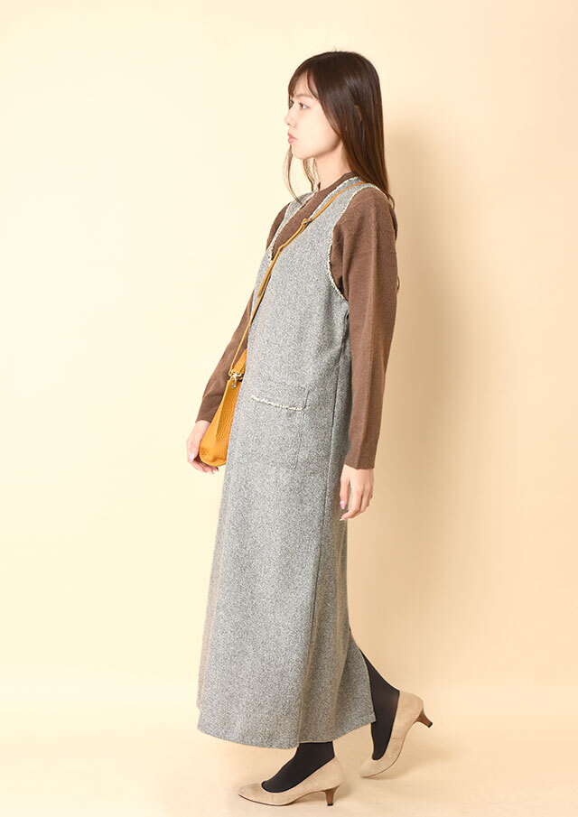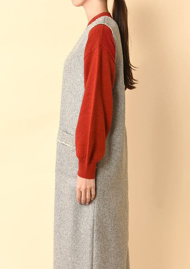 前後で異なるネックラインを楽しめるツイードのジャンパースカートです。