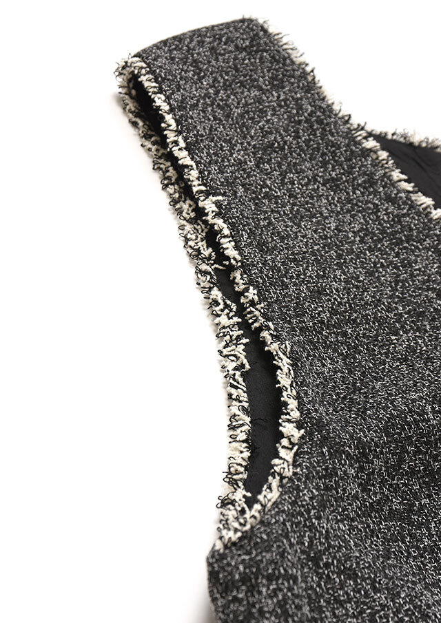 丁寧に縫い付けられたフリンジがツイードの表情をやわらげ、仕事の場にも馴染むキレイめな雰囲気にまとめています。