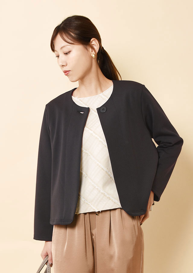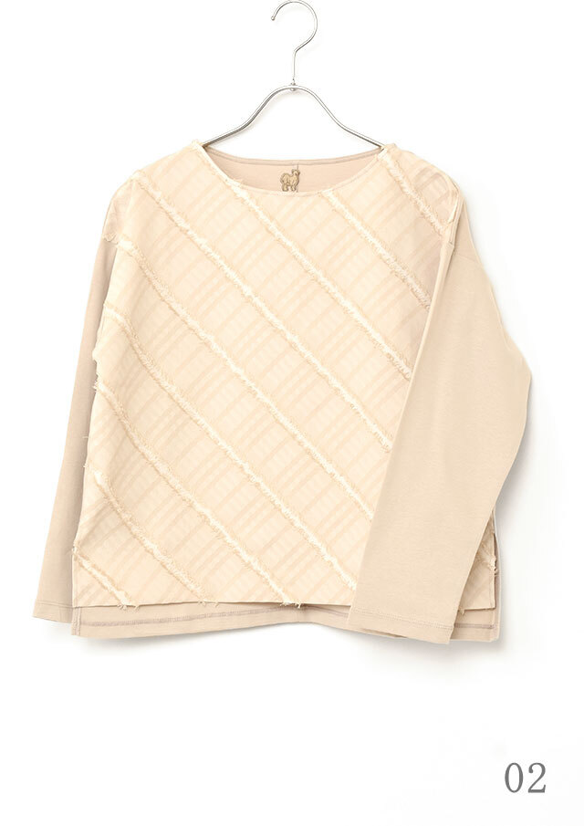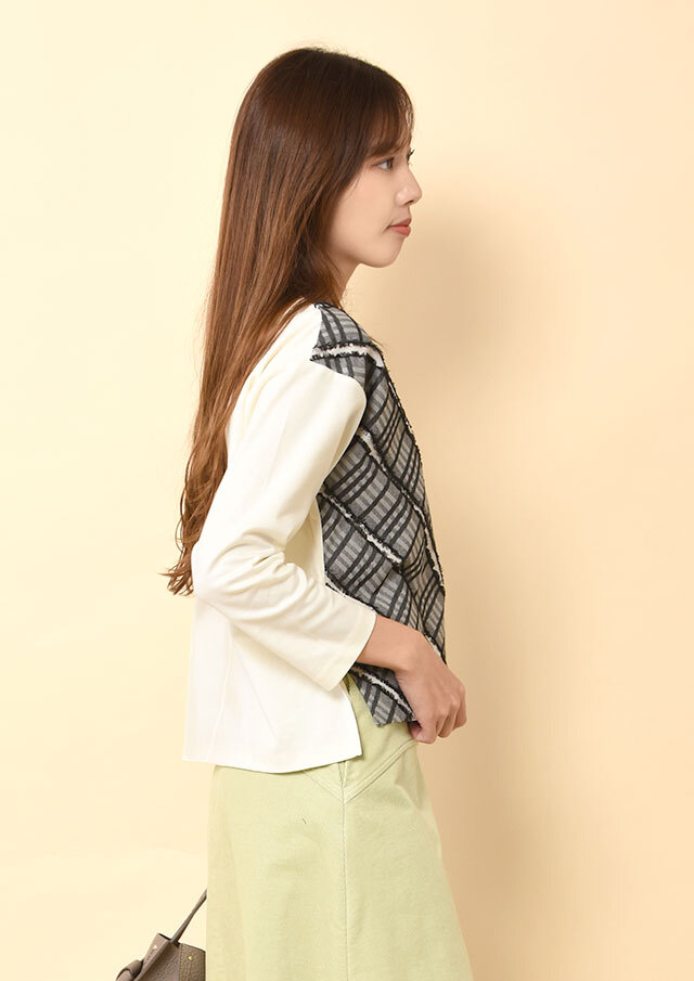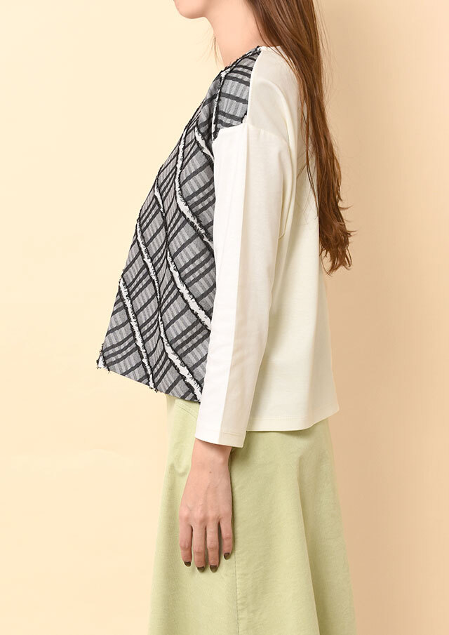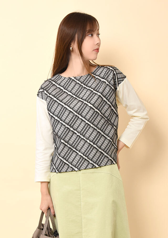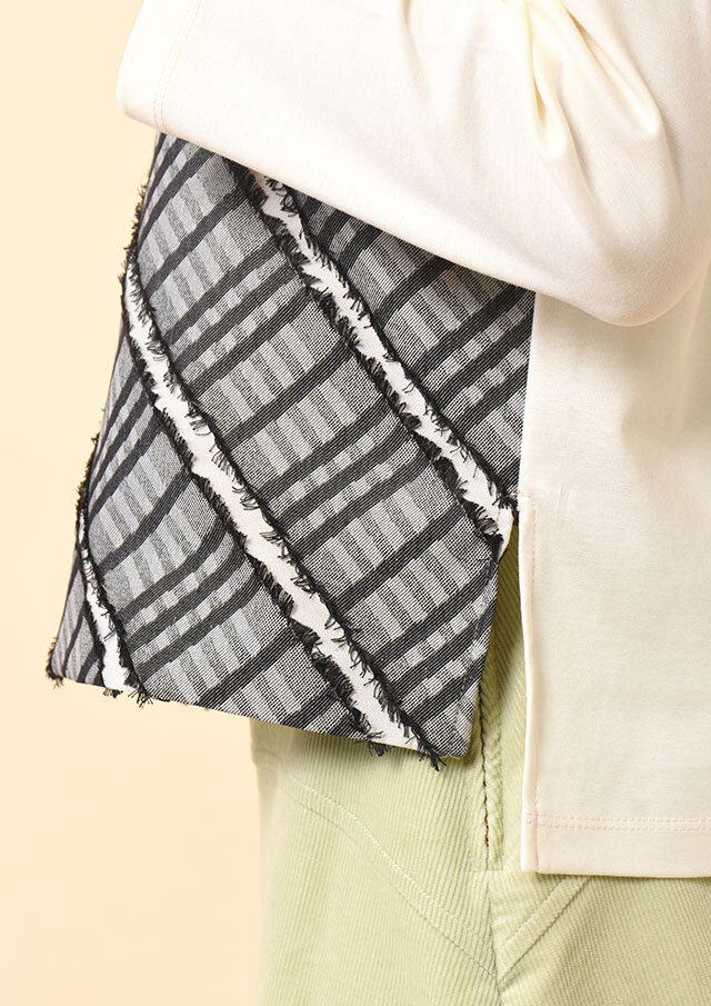 フロント部分には立体感のあるカットジャガードのチェック柄をあしらい、表情豊かに仕上げています。