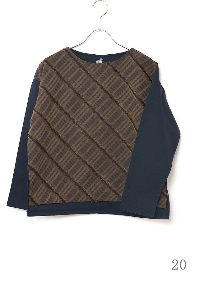 ベーシックなクルーネックの長袖カットソーに、フロントだけチェック柄を取り入れたデザイン。