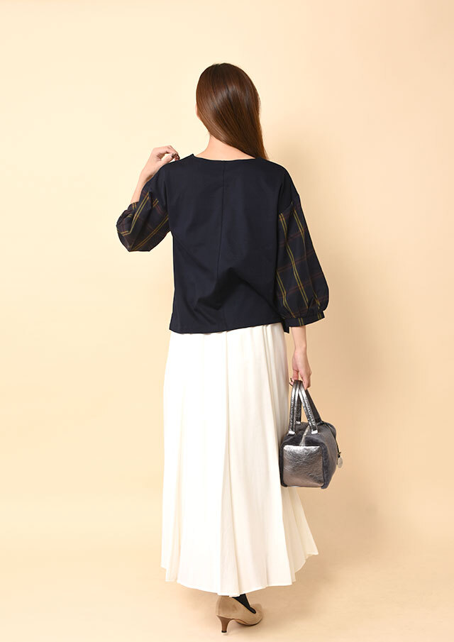 袖のチェック柄が目を引くので、シンプルなボトムスと合わせるだけでバランスの良い着こなしに。