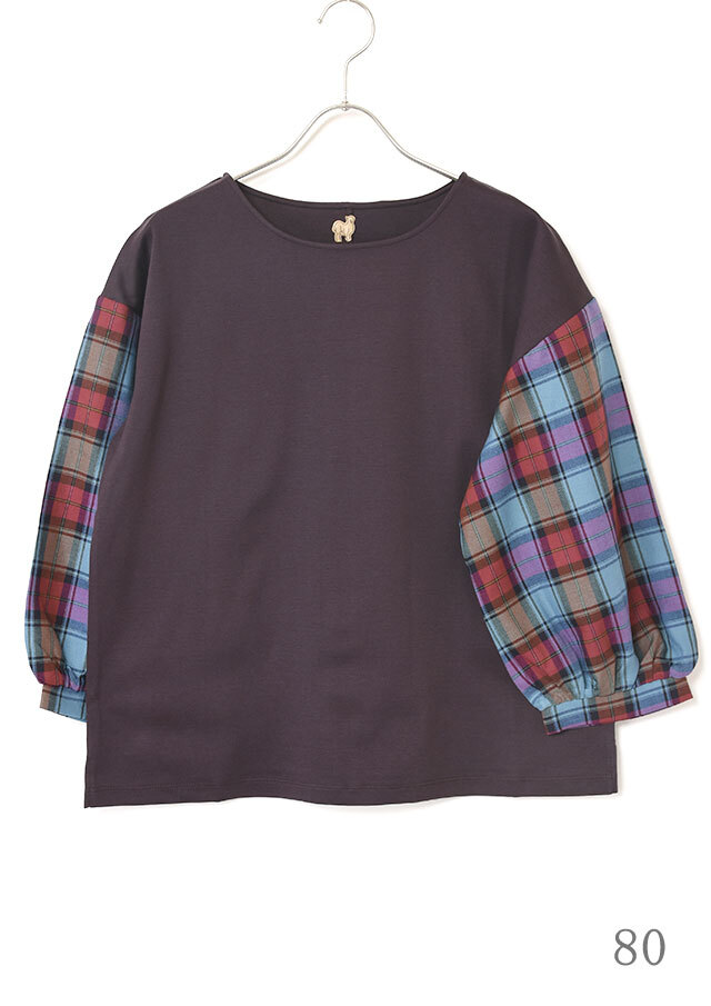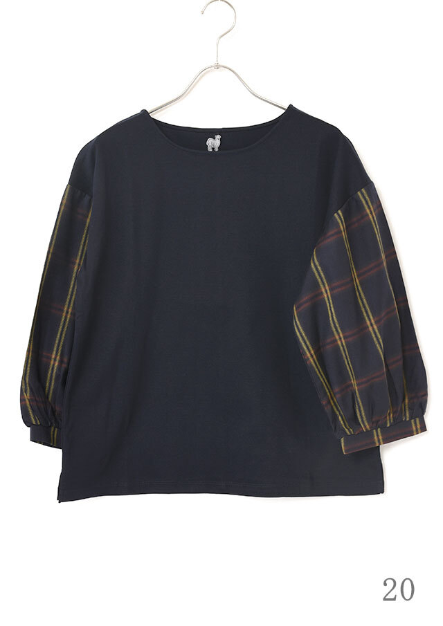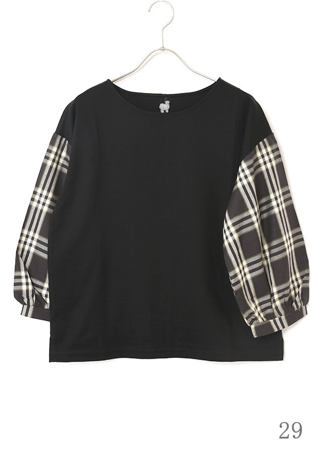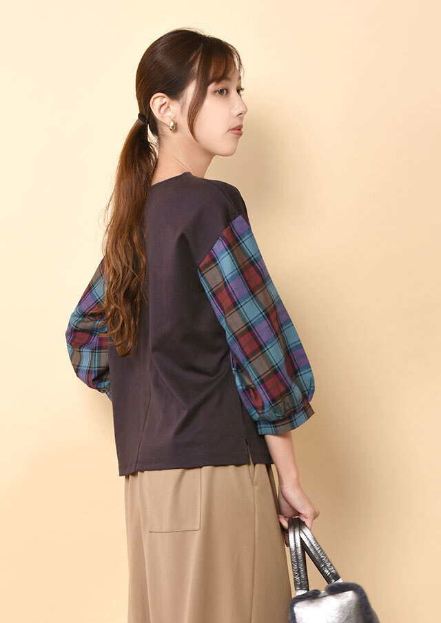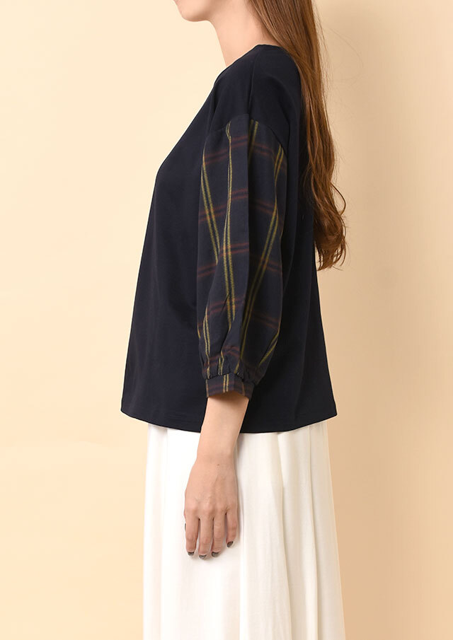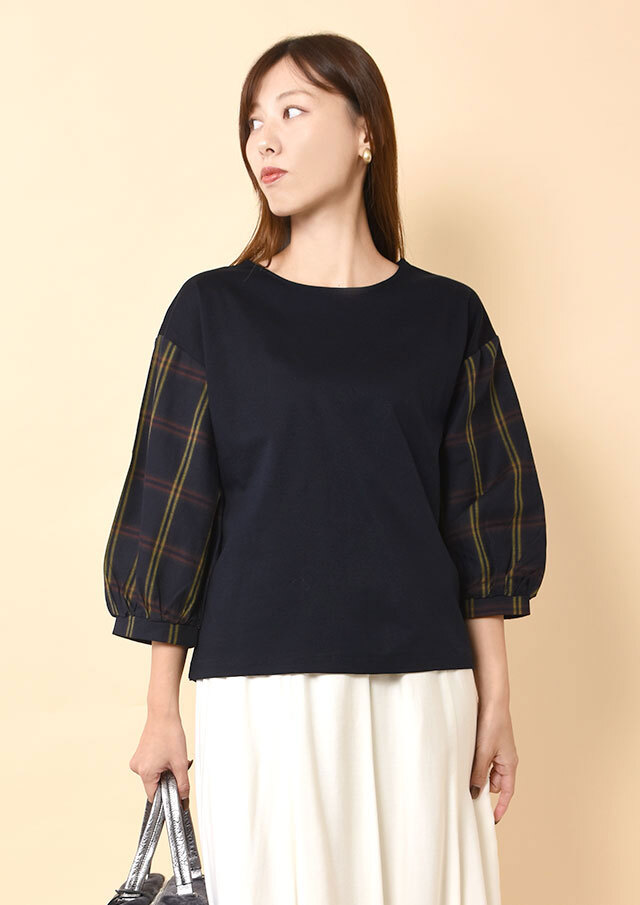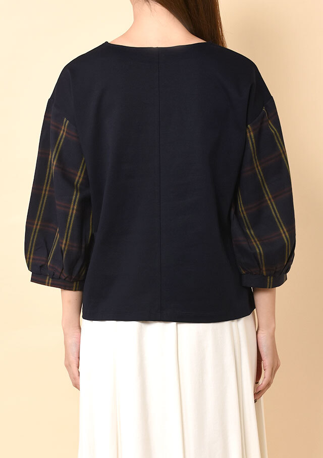 袖の布帛部分にはコットン100%のチェック生地を採用し、程よくハリ感があることで立体的なシルエットをキープ。