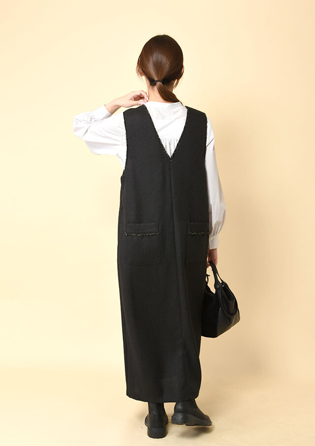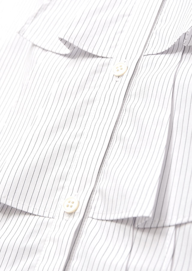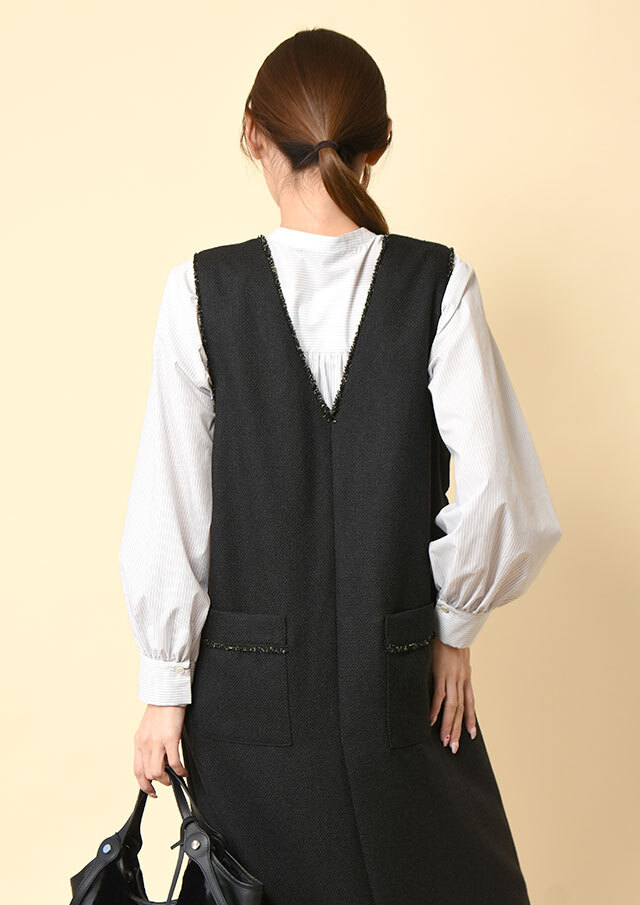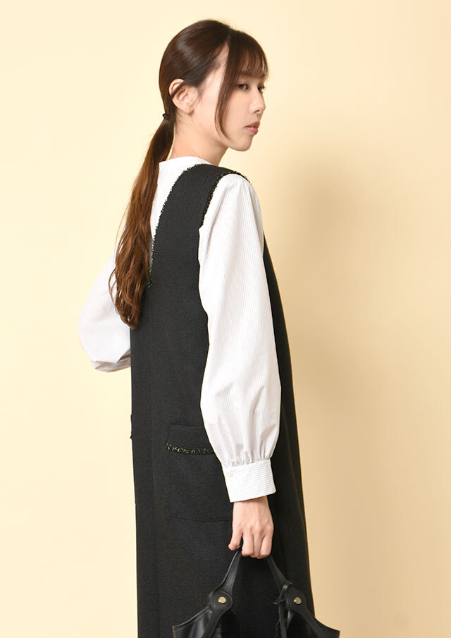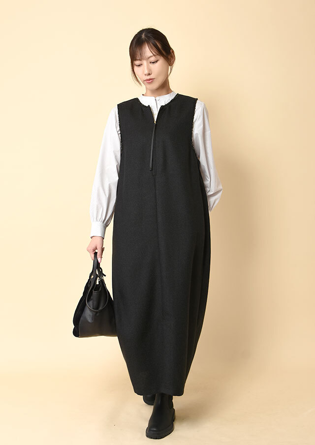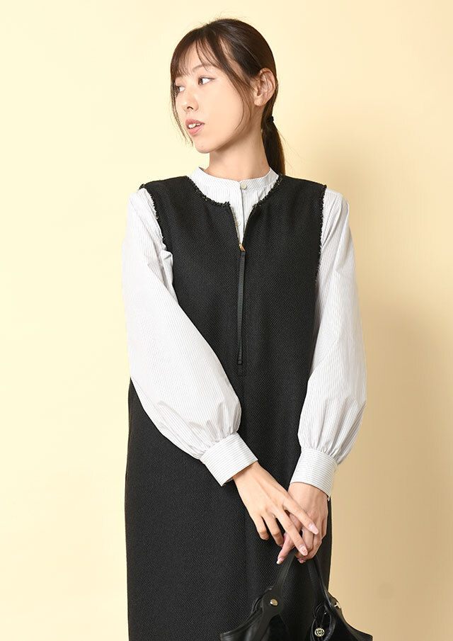 フロントにあしらった三段のラッフルフリルが、甘さではなく立体感として際立ち、シンプルなシルエットに華やぎを添えます。
