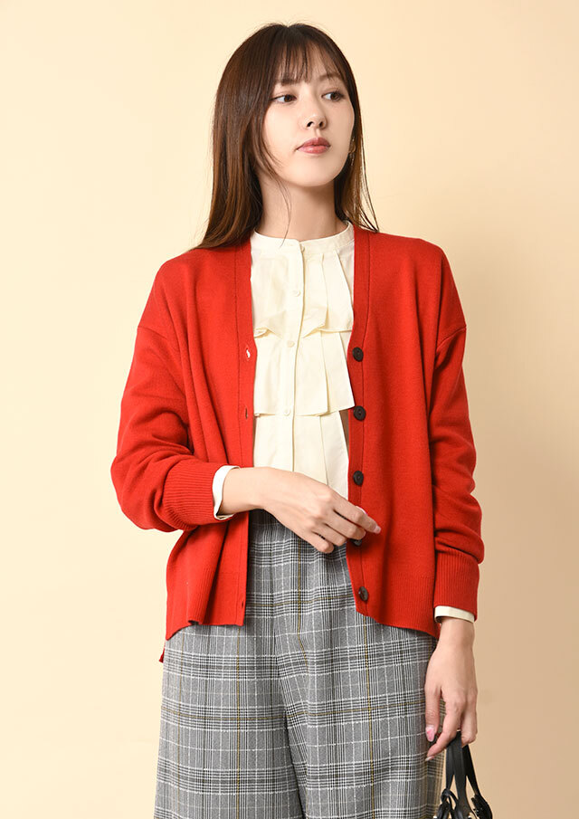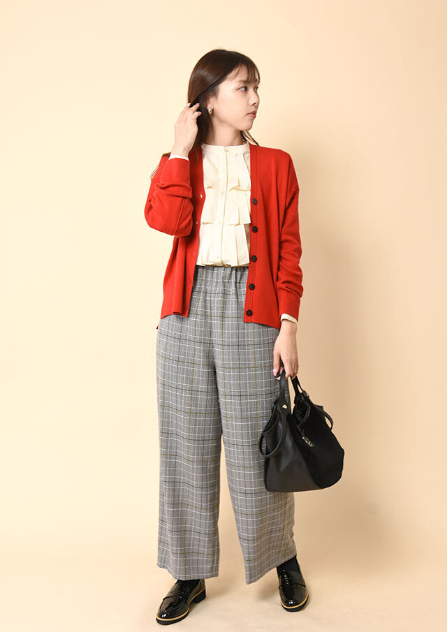 前を留めてきちんと着ればクラシックな雰囲気が引き立ち、ボトムのシルエットを選ばず洗練された印象にまとまります。