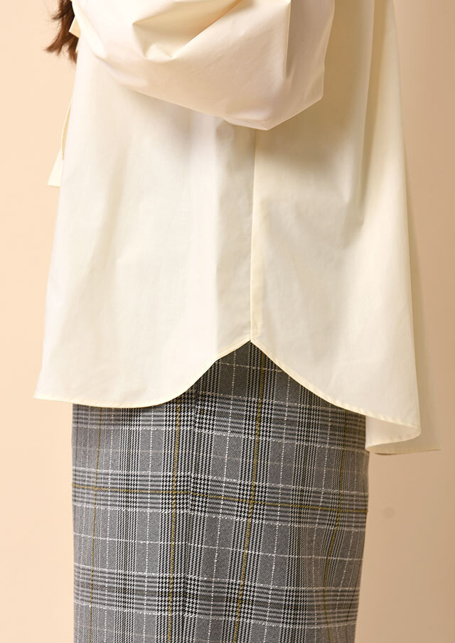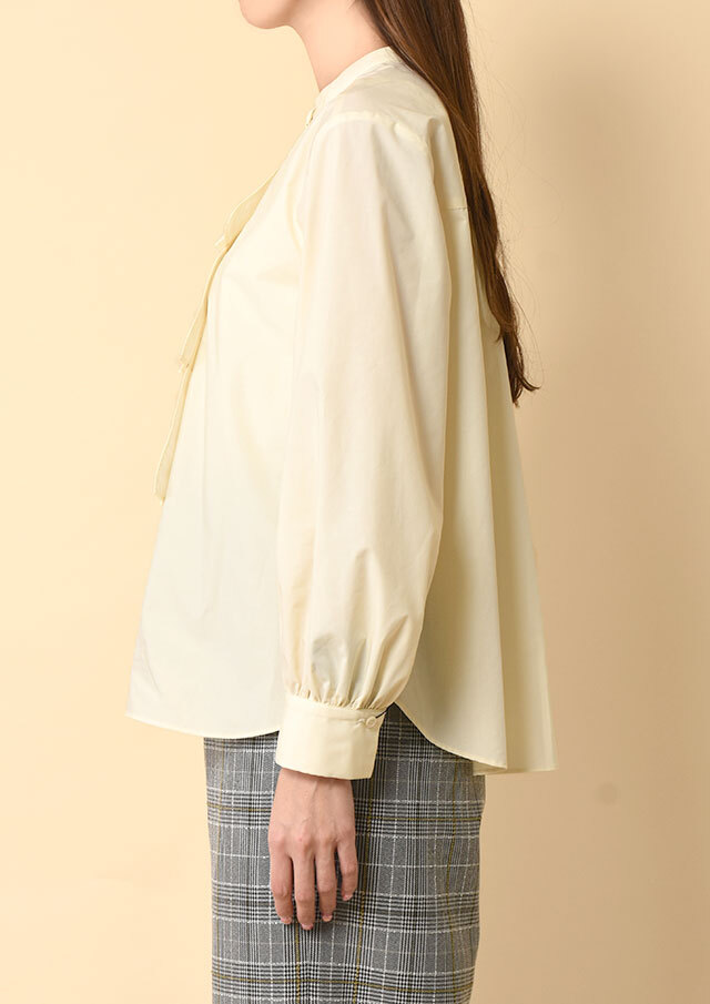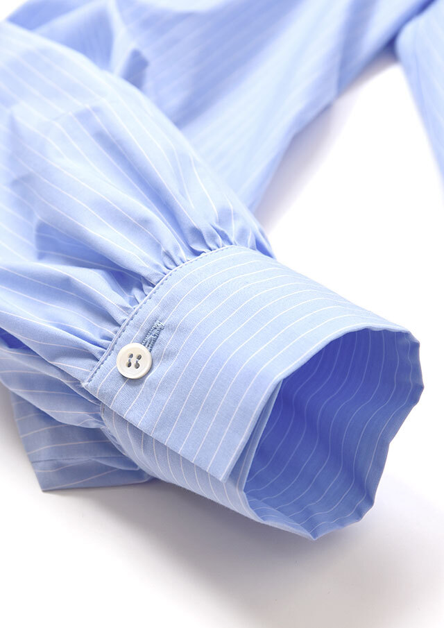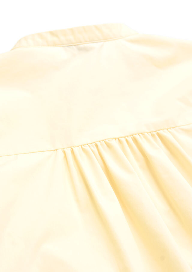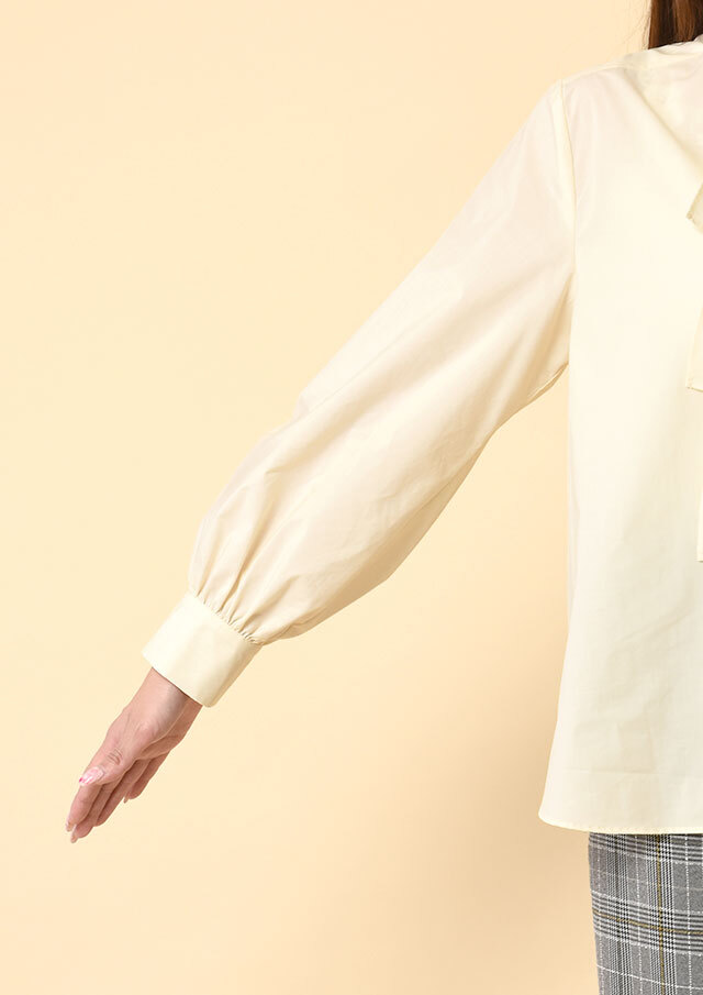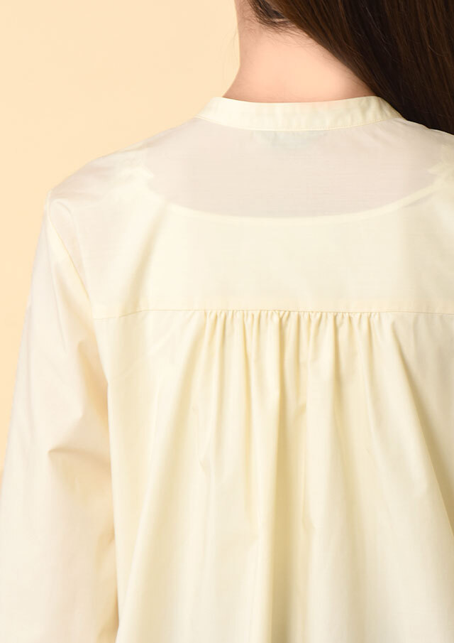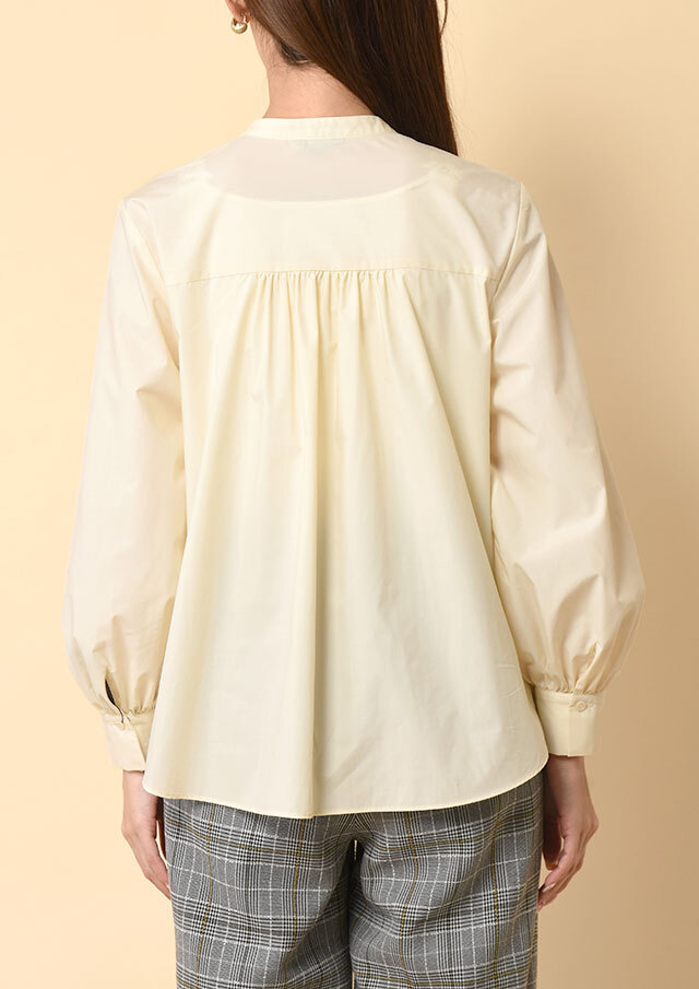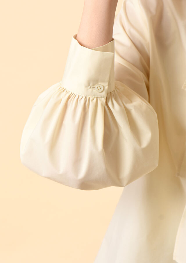 バックヨークから入ったギャザーが後ろ姿にもやわらかな表情を生み、袖口のカフスにもギャザーを寄せることで、動いたときにふわりとしたニュアンスが生まれる仕立てになっています。