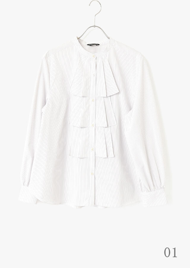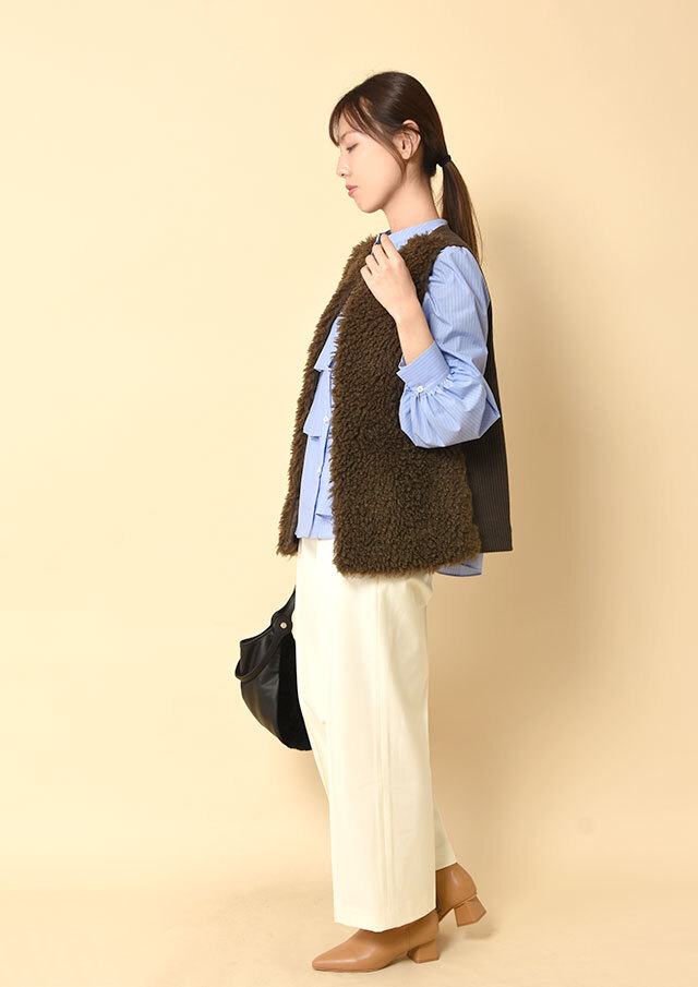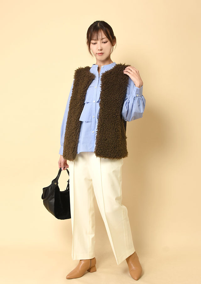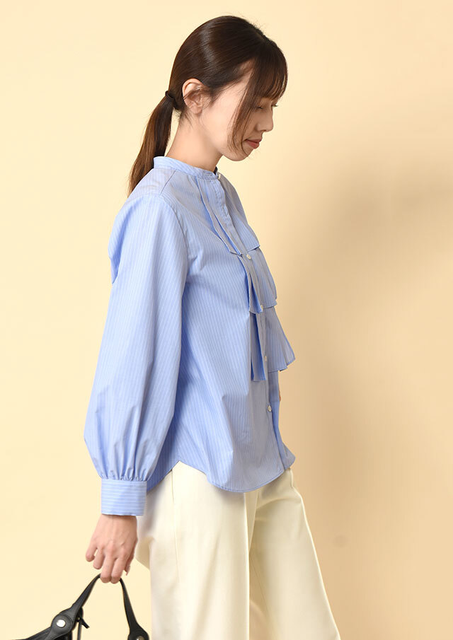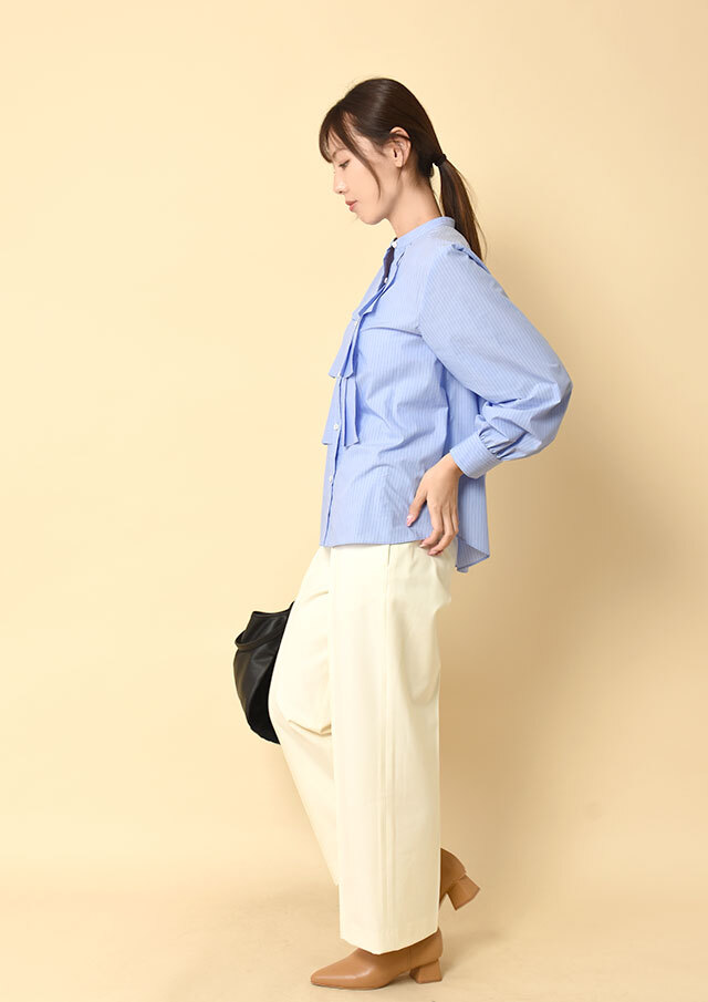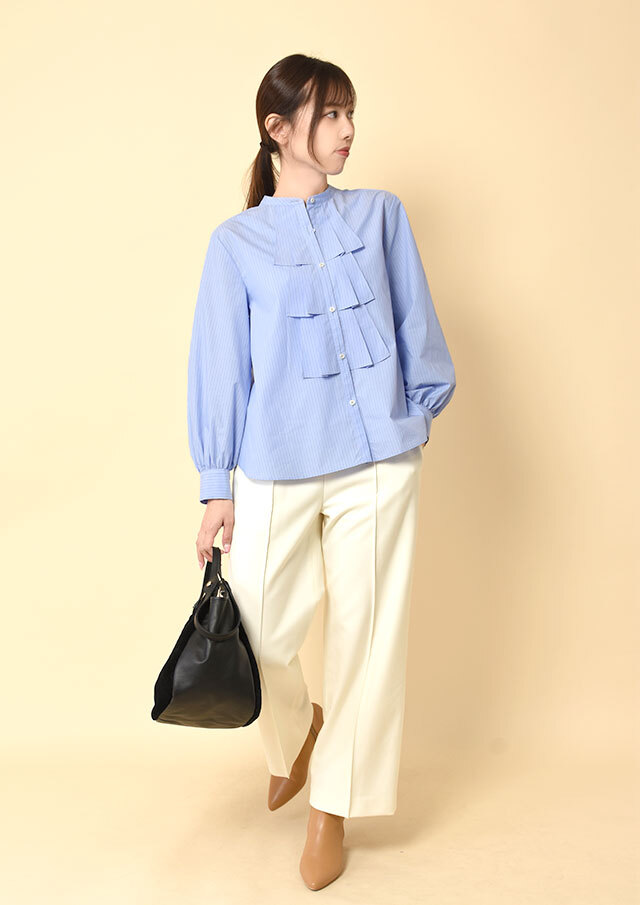 また、裾を軽くタックインすればフリルの立体感が際立ち、ストライプなら凛としたムード、無地ならやわらかさを感じる装いに。