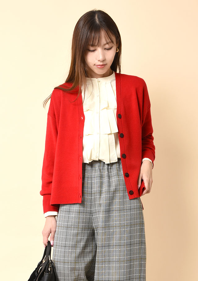 ジャケットやカーディガンを合わせると、ラッフルフリルだけが顔まわりにのぞき、控えめなのにしっかりとポイントになるスタイリングが完成します。