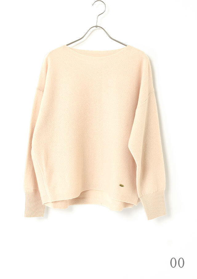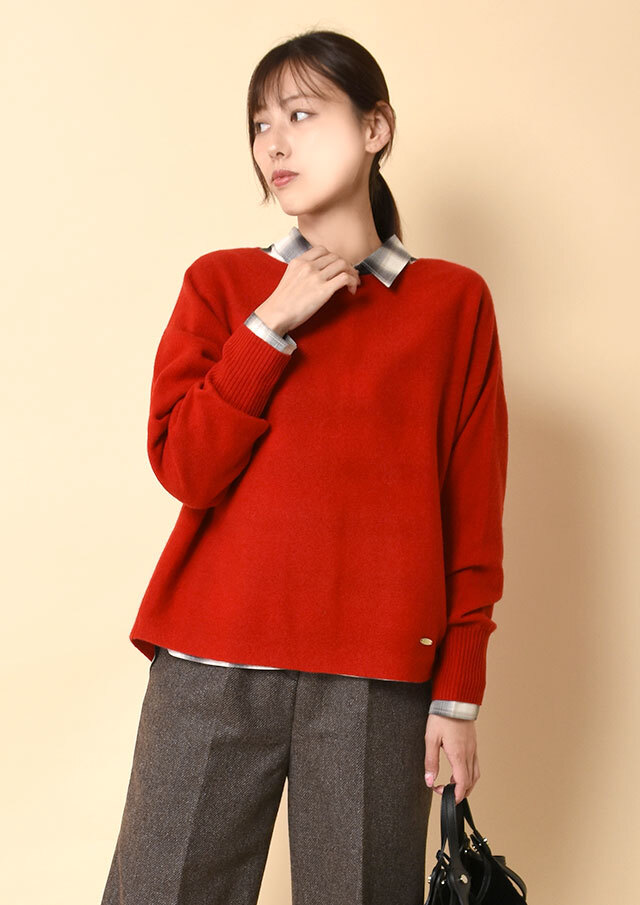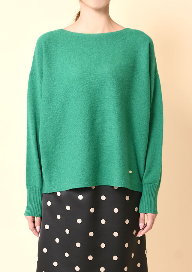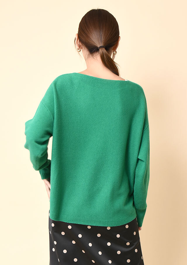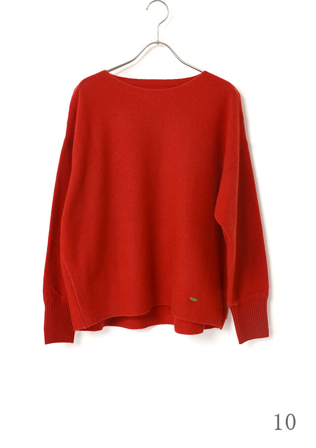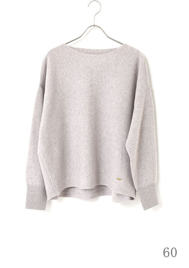 ボートネックの開きが顔まわりをスッキリ見せてくれる、シンプルな単色のプルオーバーニットです。