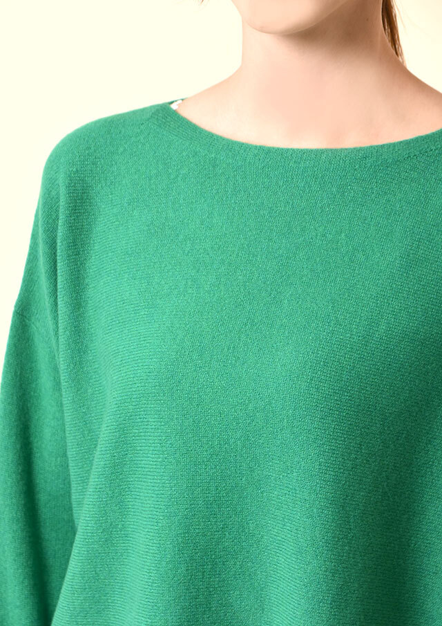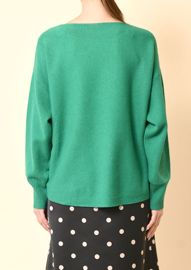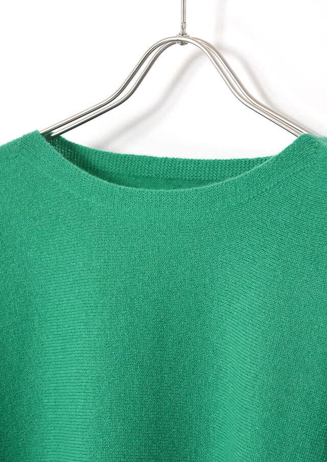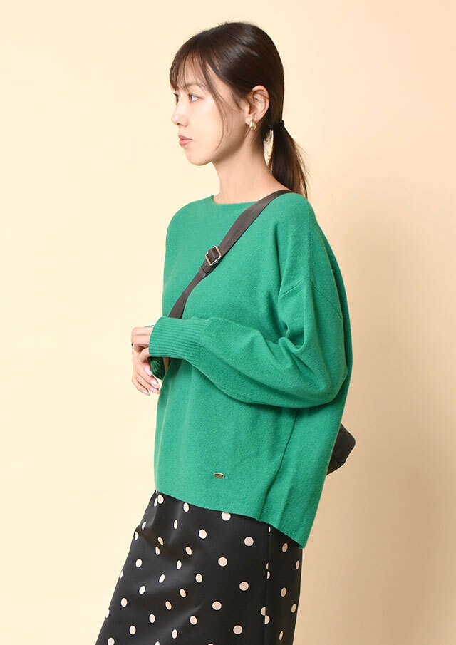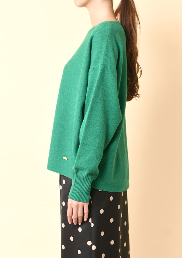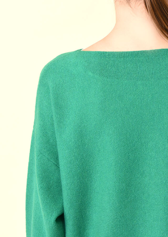 ボートネックの開きが顔まわりをスッキリ見せてくれる、シンプルな単色のプルオーバーニットです。