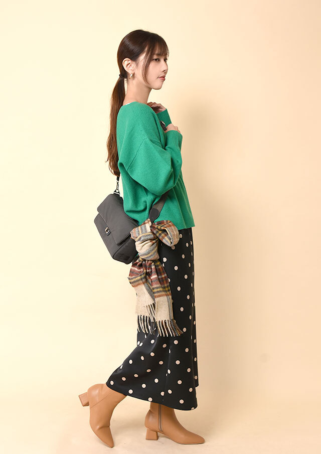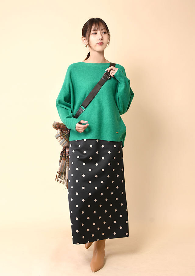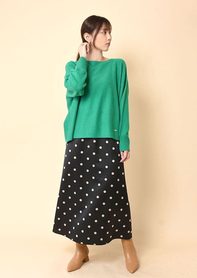 スカートと合わせると、裾の流れるような落ち感が揺れてやわらかな印象にまとまり、軽やかさが引き立ちます。