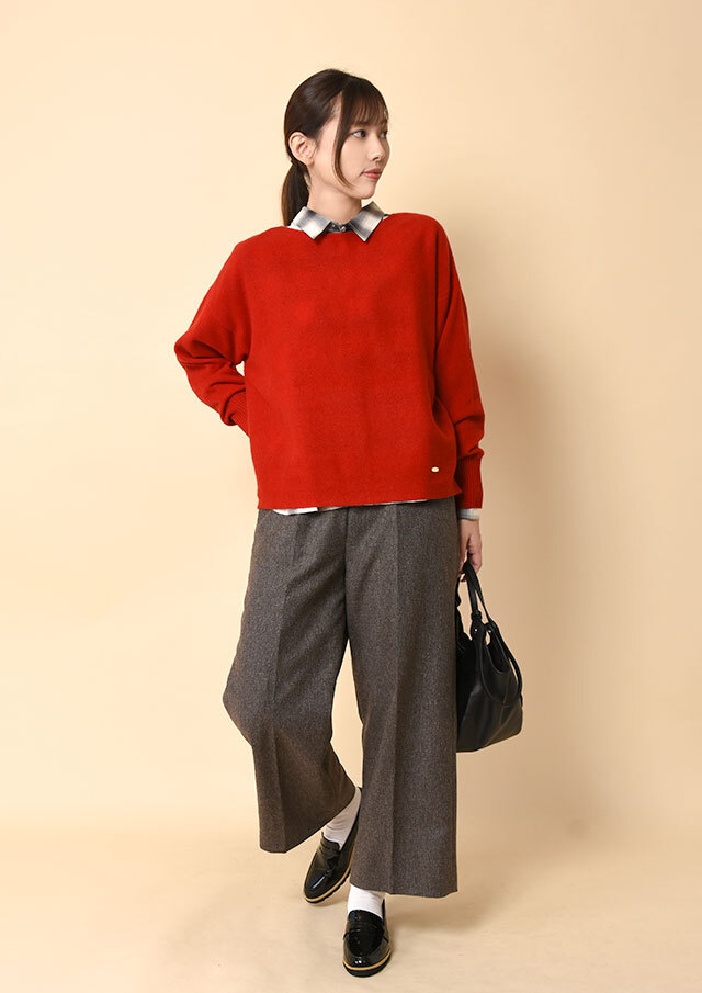 パンツと組み合わせるときは、ボートネックの抜け感が大人らしいバランスをつくり、シンプルでも整ったスタイルに。