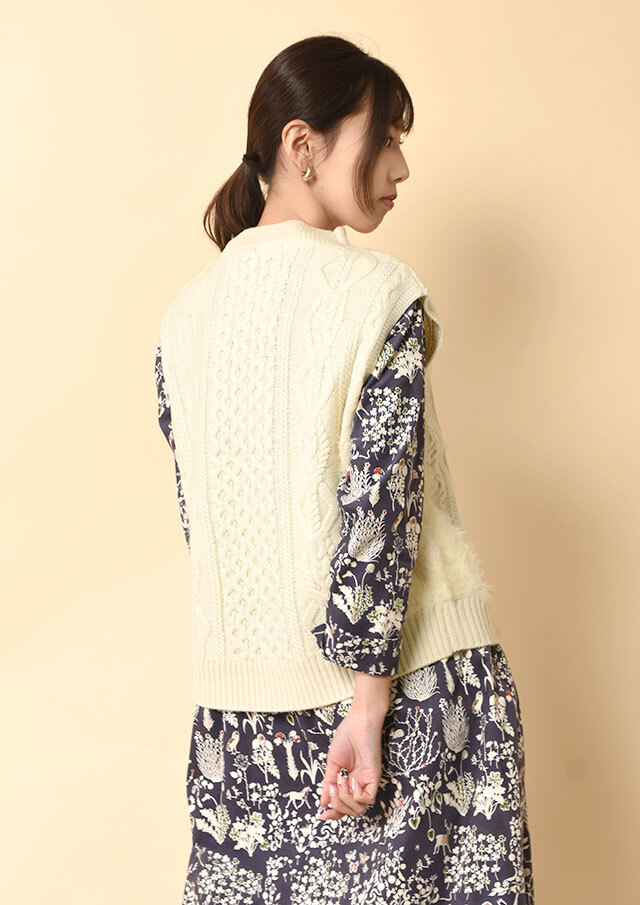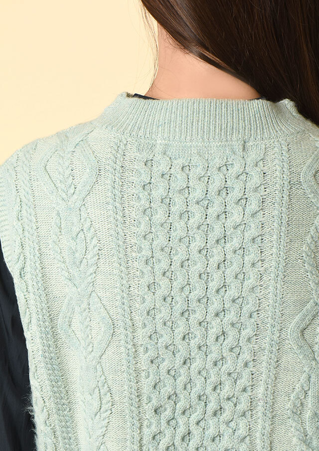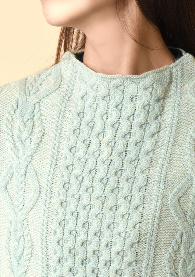 身頃はケーブル編みやかのこ編みなど、複雑なアラン模様を組み合わせて立体的に仕上げました。