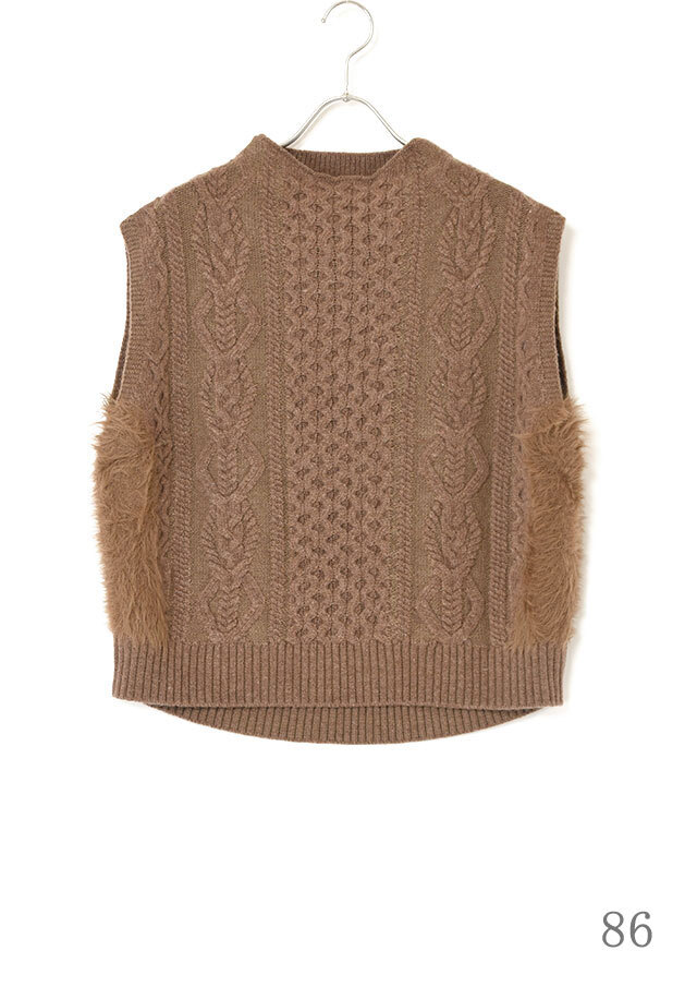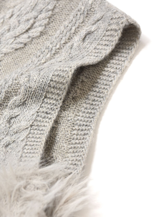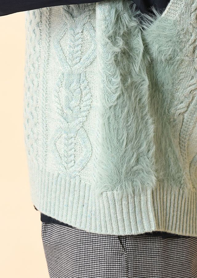 サイド部分には同系色のフェザーヤーンで切り替えを入れ、さりげないカラーブロックのニュアンスをプラス。