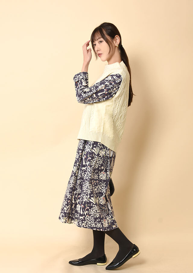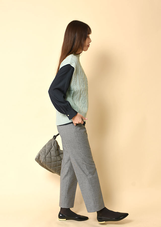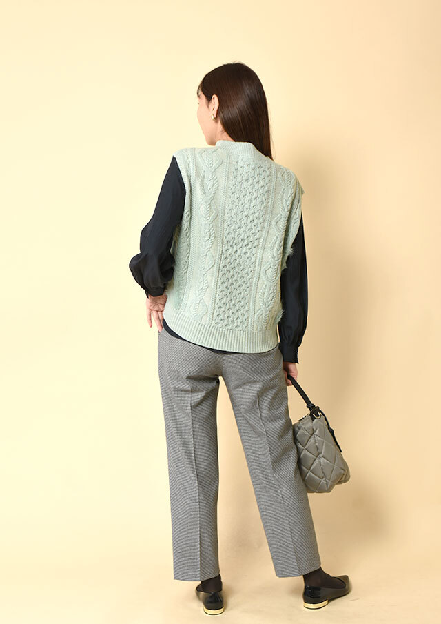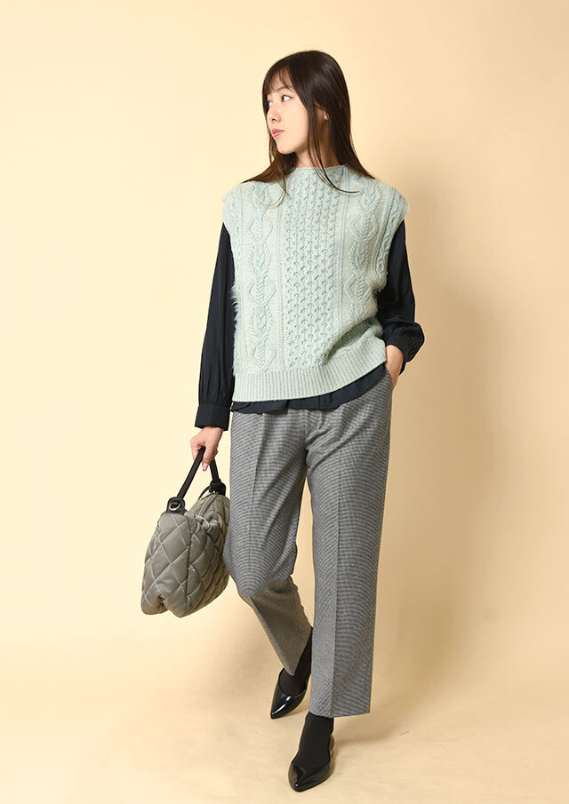 ボトムはタイトパンツやスカートでも、ワイドパンツでも、ベストの立体感が自然にバランスを整えてくれます。