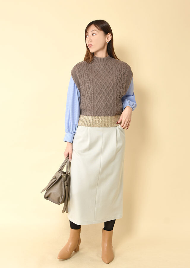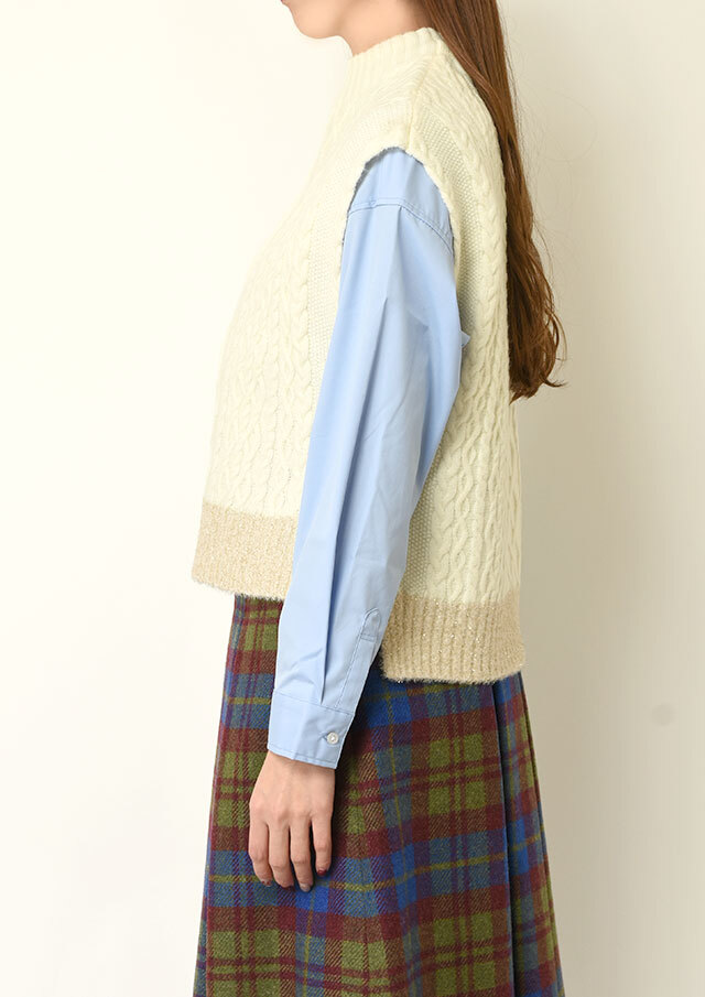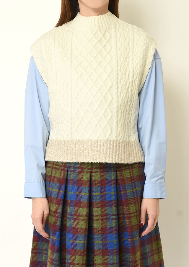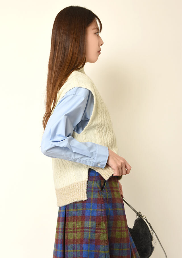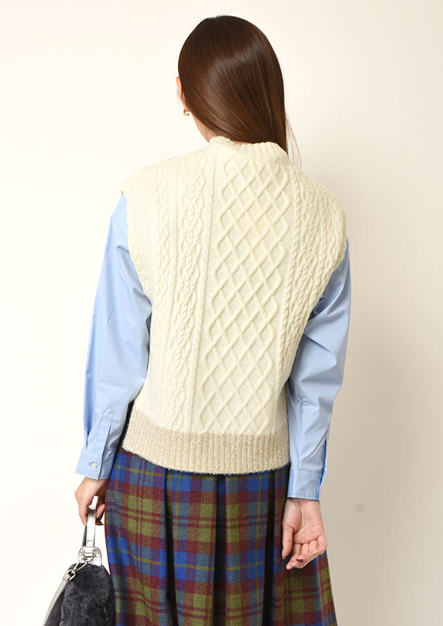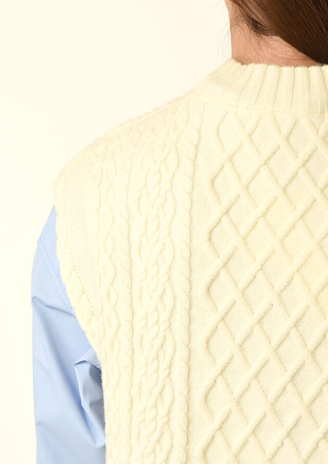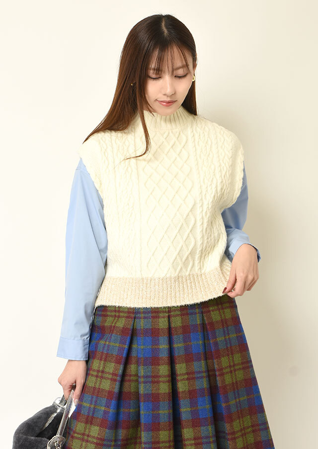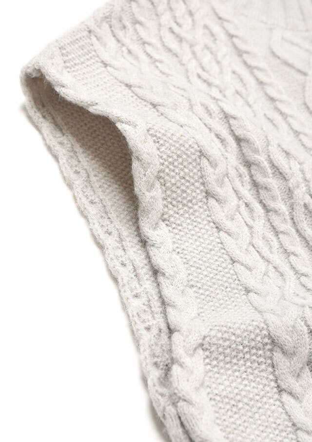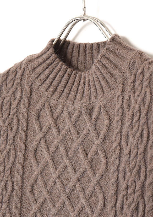 シャツやブラウスに重ねると、ケーブル編みの立体感とハイネックがきちんと感を演出し、程よく品のあるスタイリングに仕上がります。