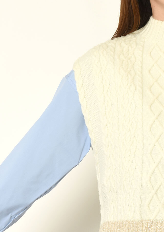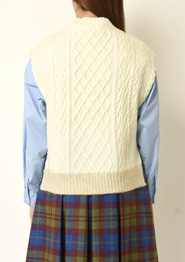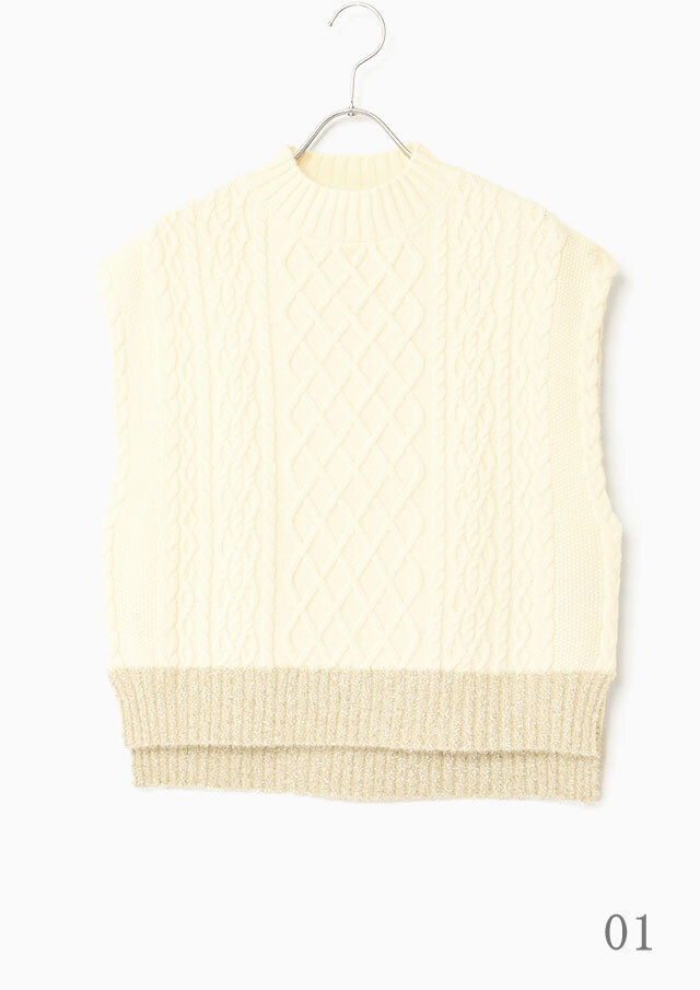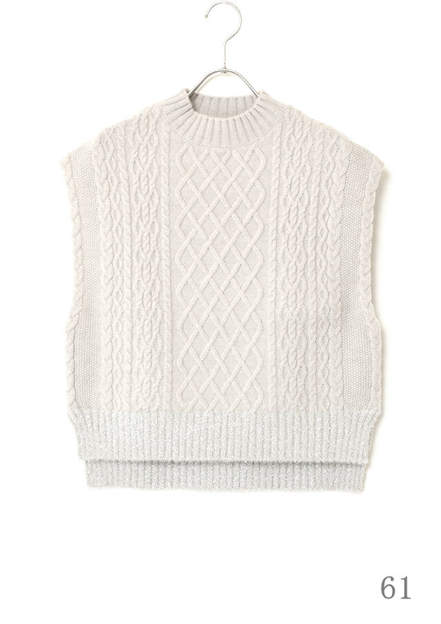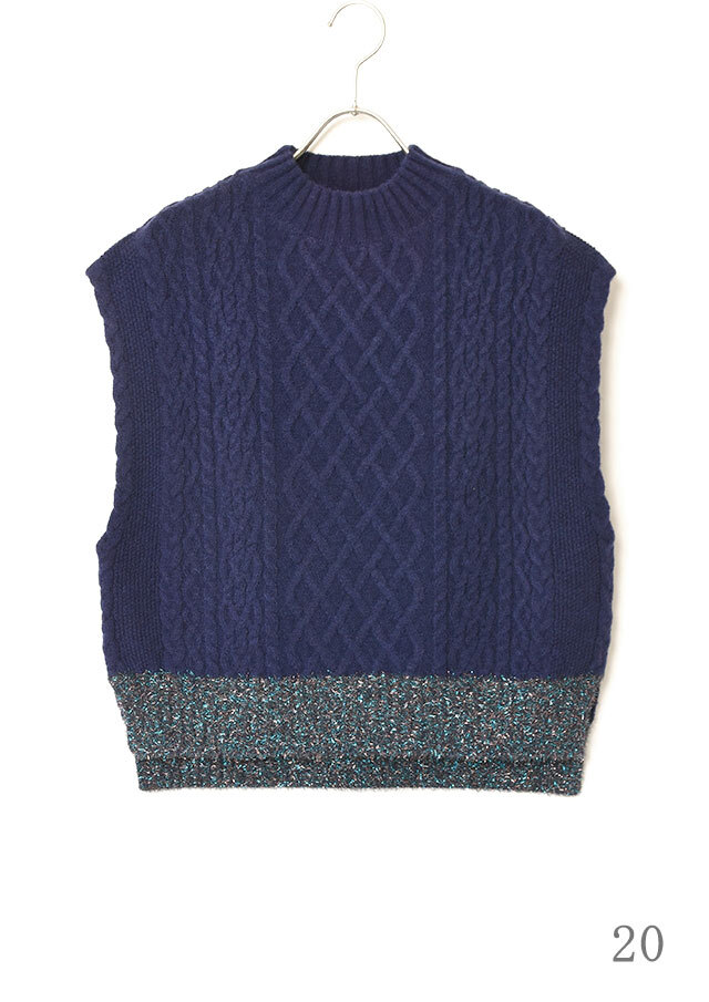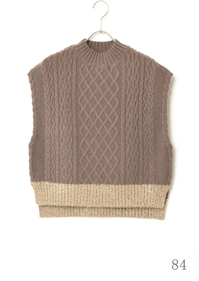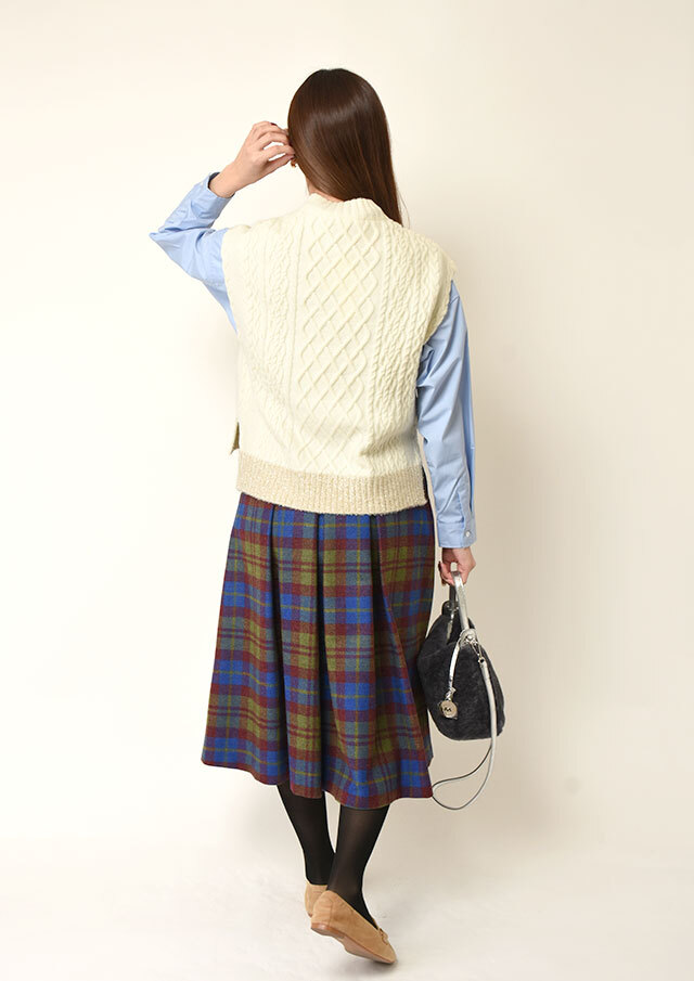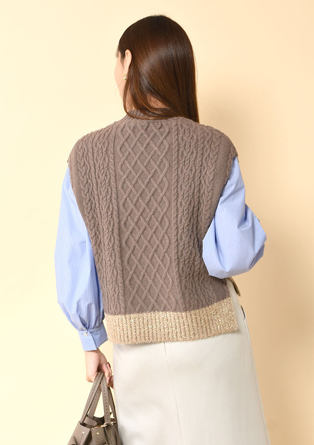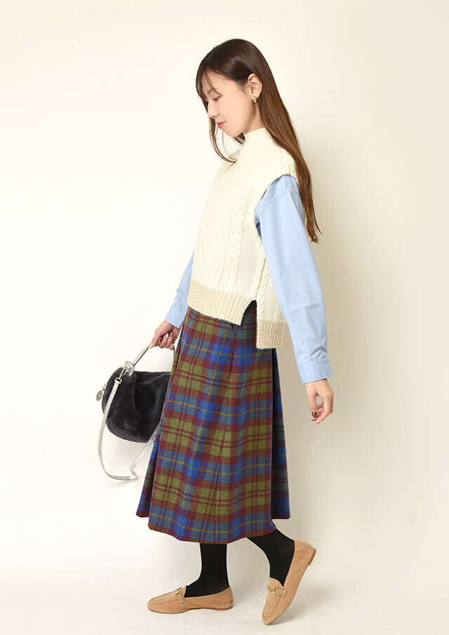 シャツやブラウスに重ねると、ケーブル編みの立体感とハイネックがきちんと感を演出し、程よく品のあるスタイリングに仕上がります。