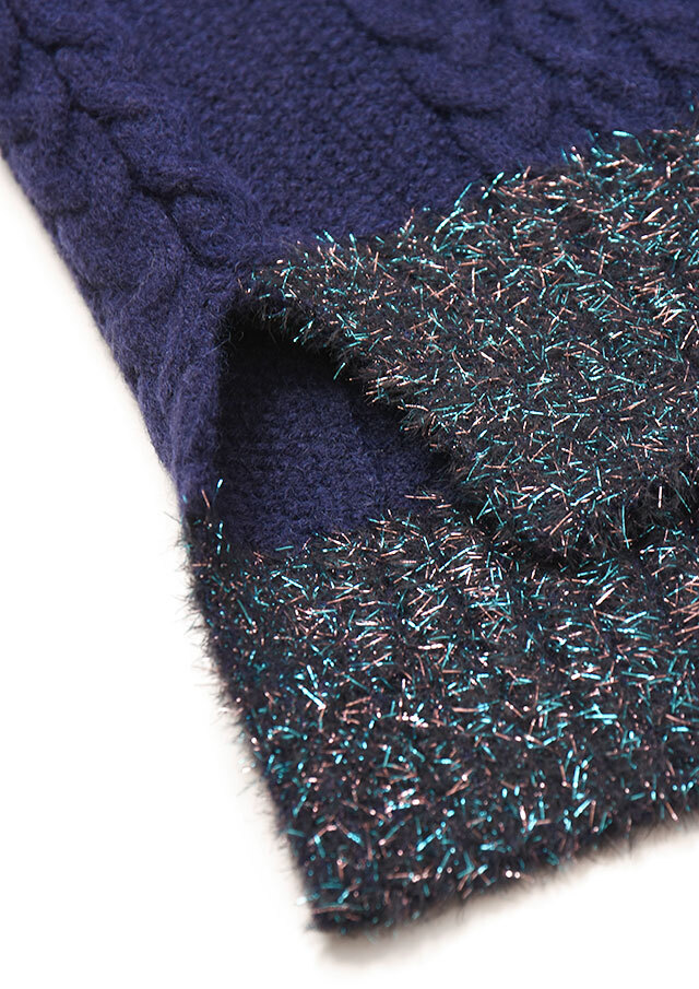 身頃はベーシックなカラーでまとめ、裾にはラメ糸を効かせた華やかなアクセントを添えています。