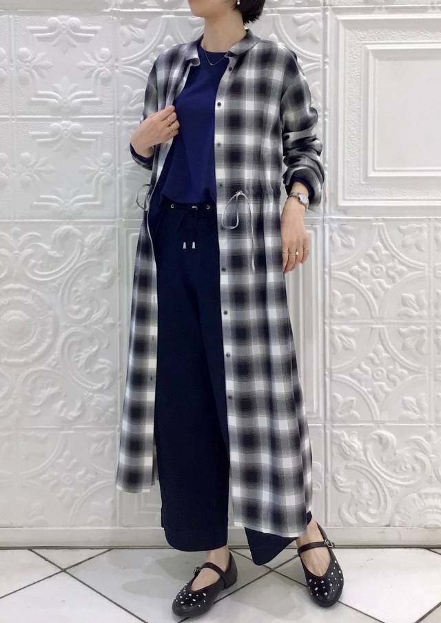 前後差のある着丈と、後ろ裾の切り替えが立体感を生み、動きのあるシルエットを演出。