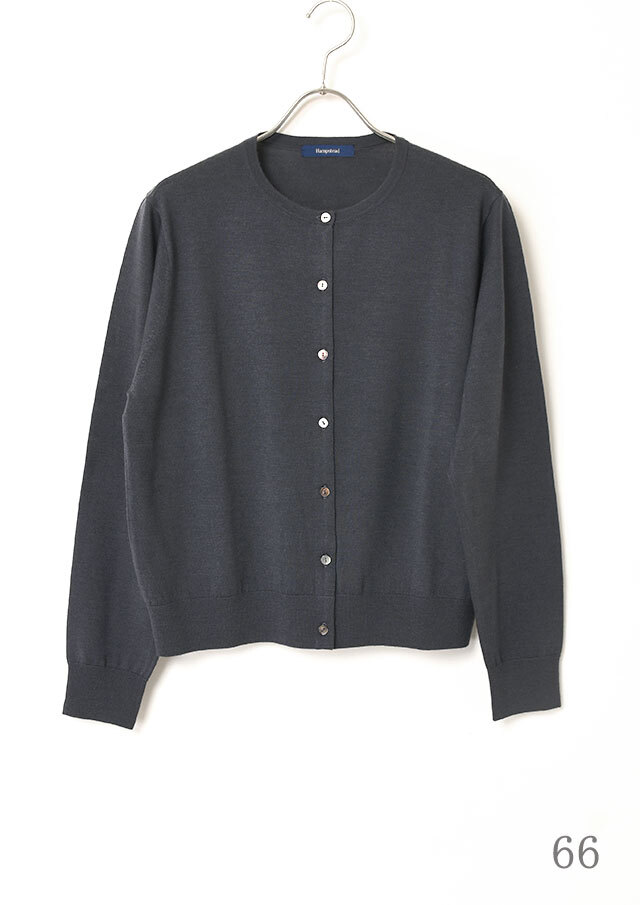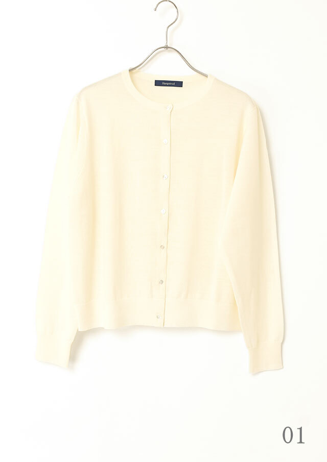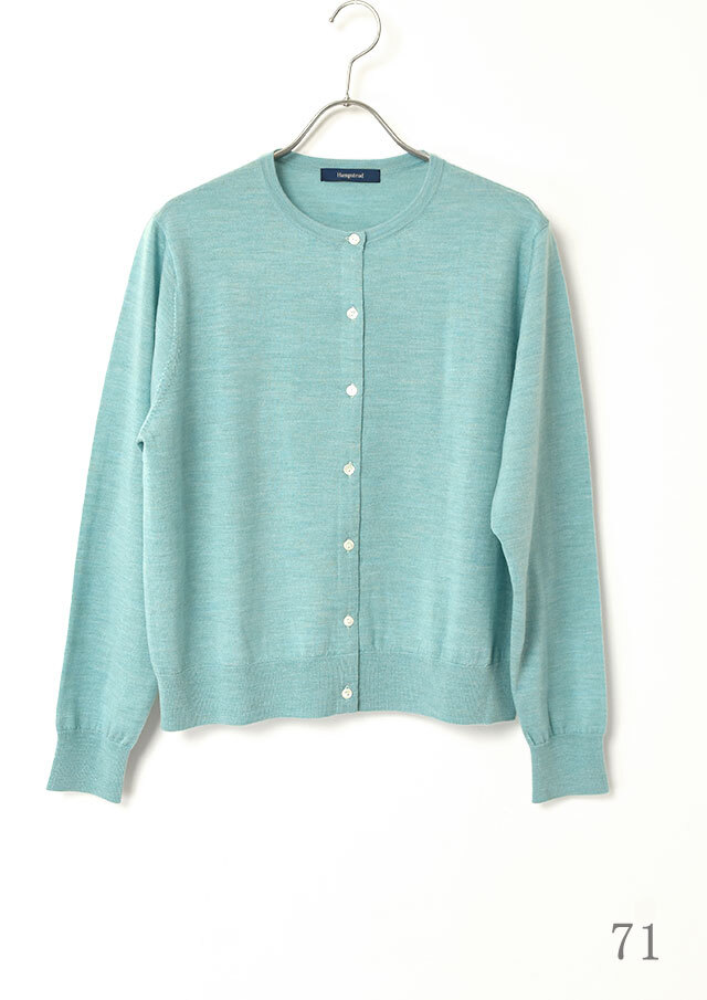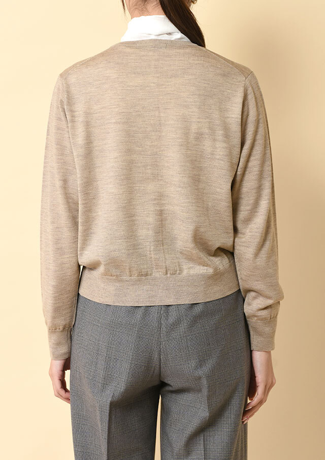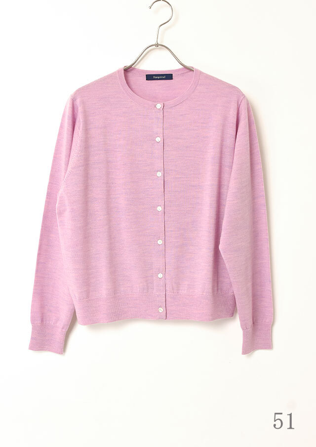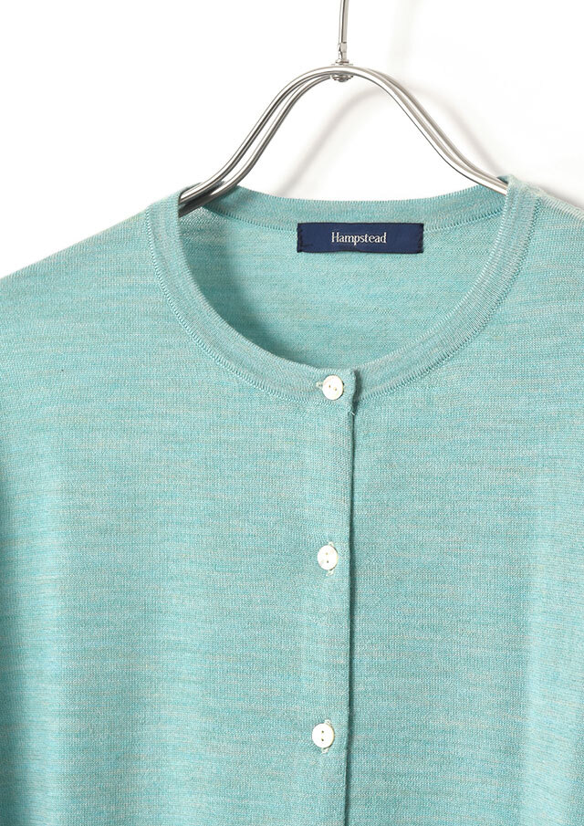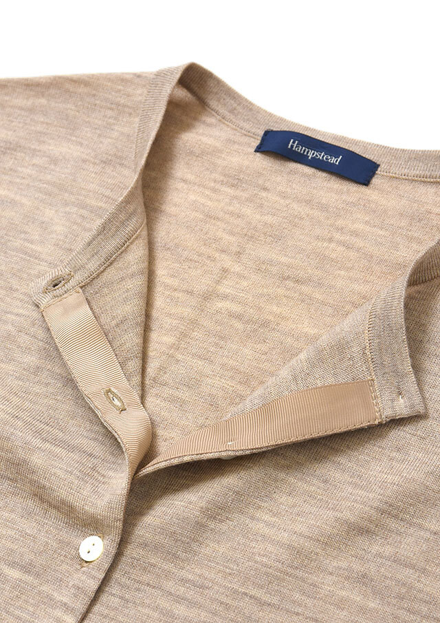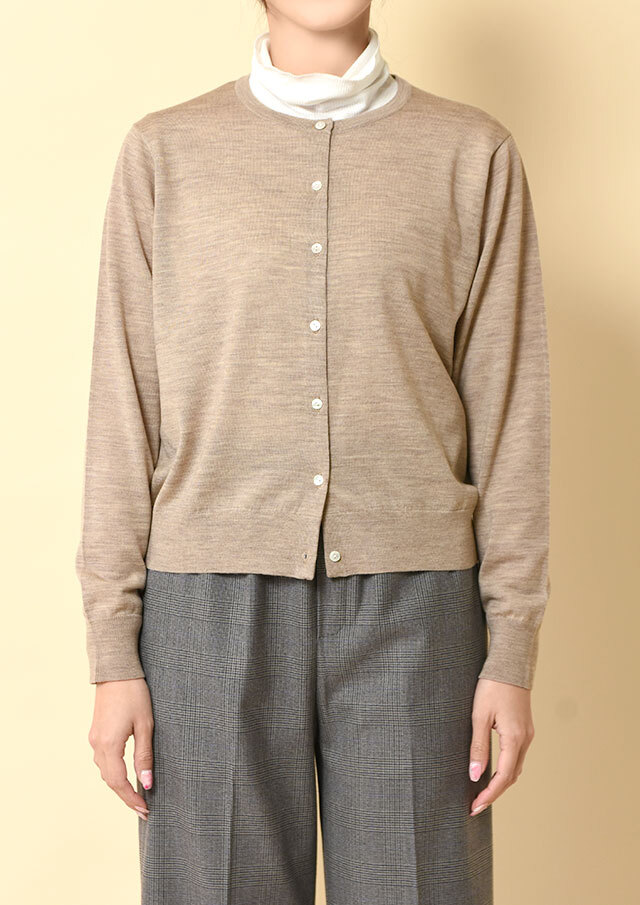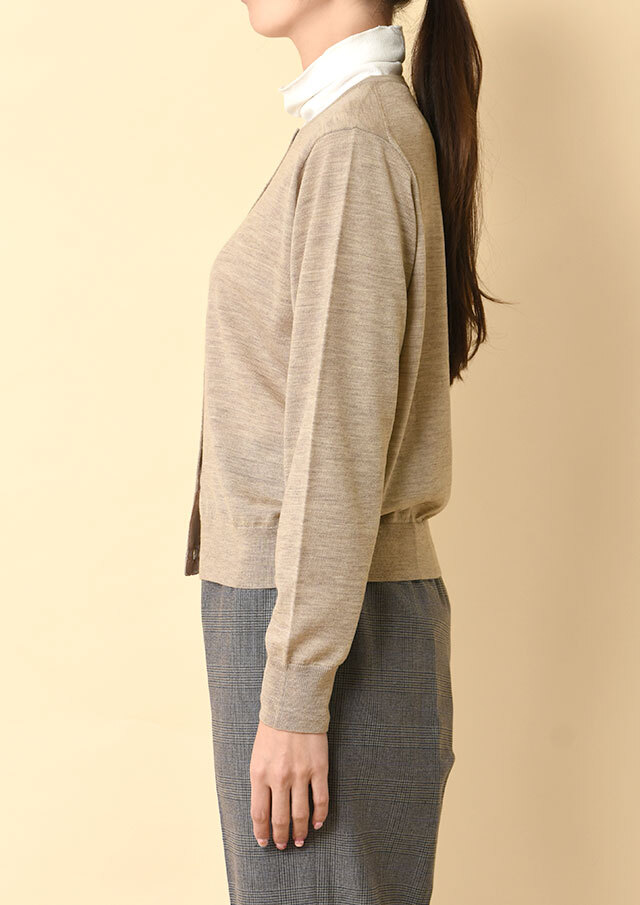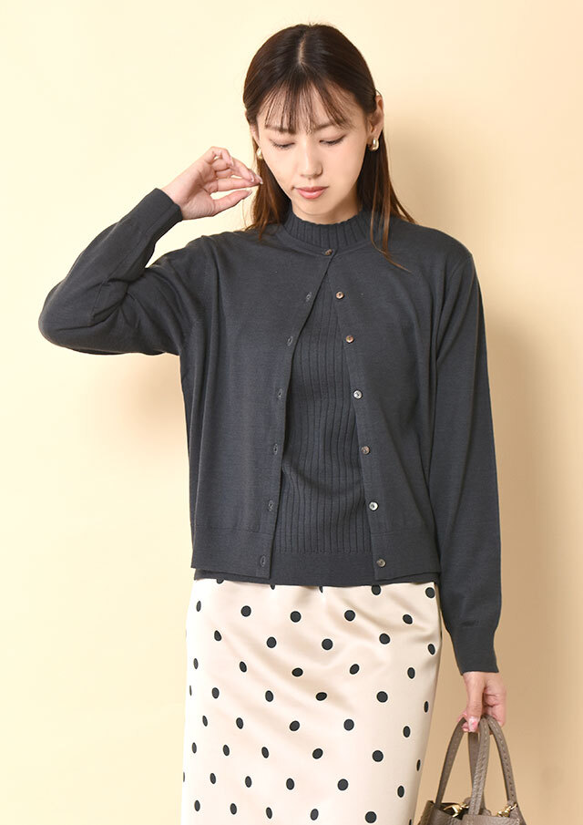 ノーカラーのシンプルなカーディガンは、前立て部分の裏に同系色のグログランテープをあしらい、さりげない上品さを添えています。