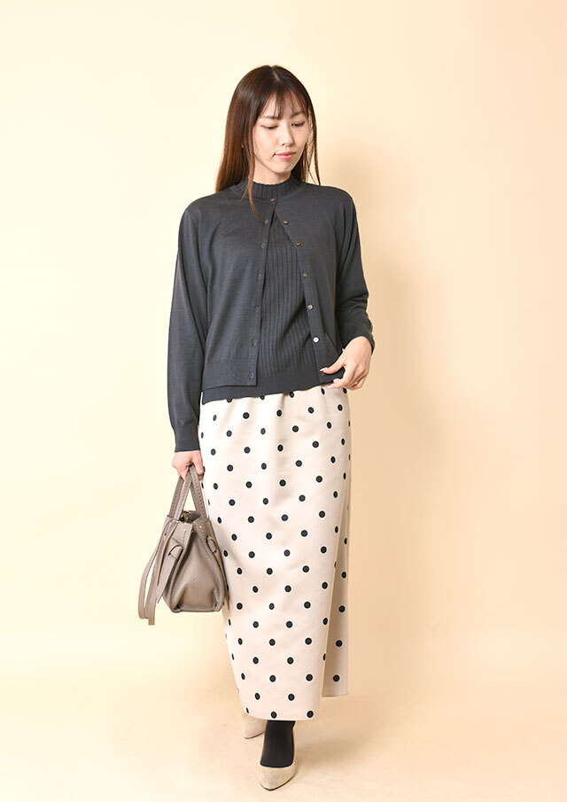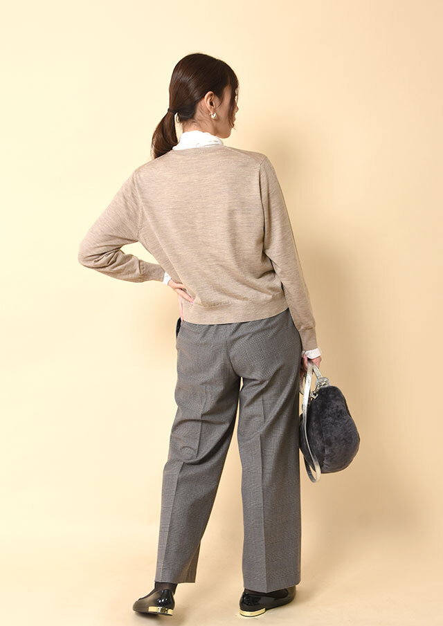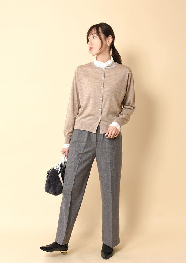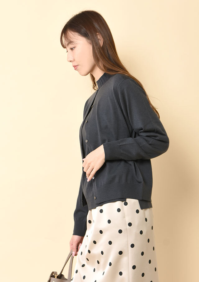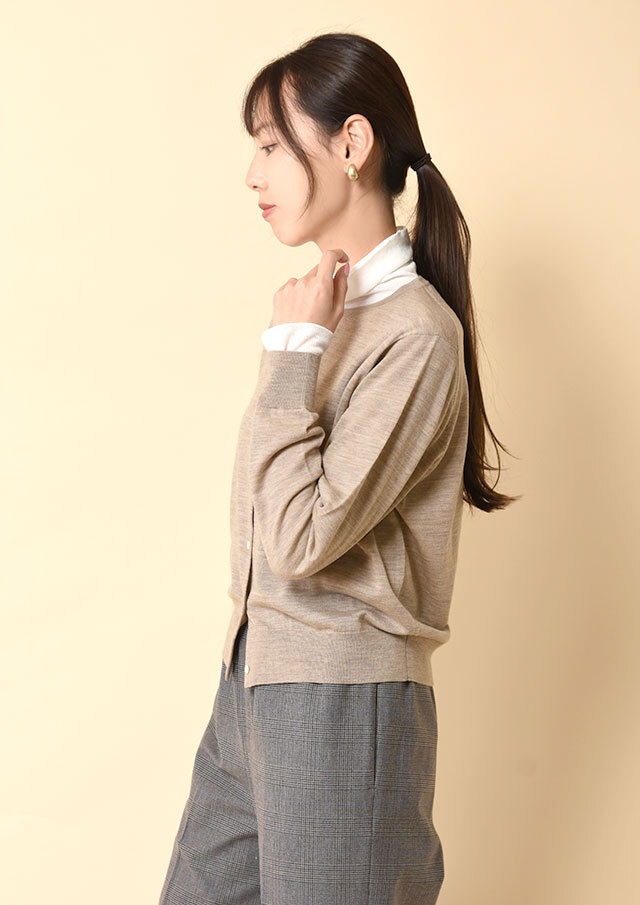 前を開けて軽く羽織れば、カーディガンのやわらかなドレープが生きて、顔周りがスッキリと見えます。