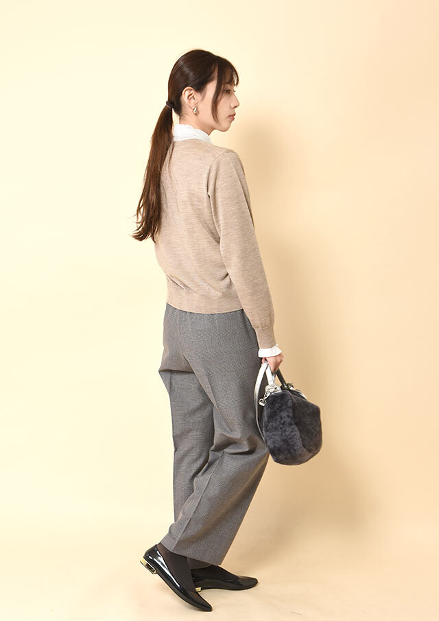 ボトムにはテーパードパンツやタイトシルエットのスカートを合わせると、全体のシルエットが美しく整い、きちんと感を保ちながらもフェミニンな雰囲気に。