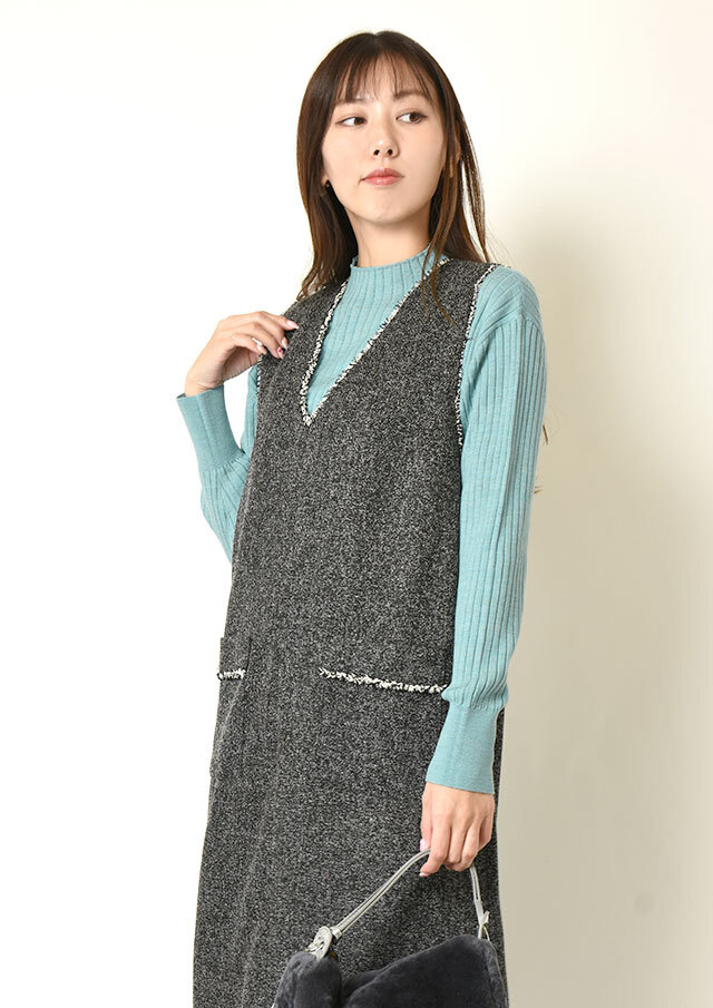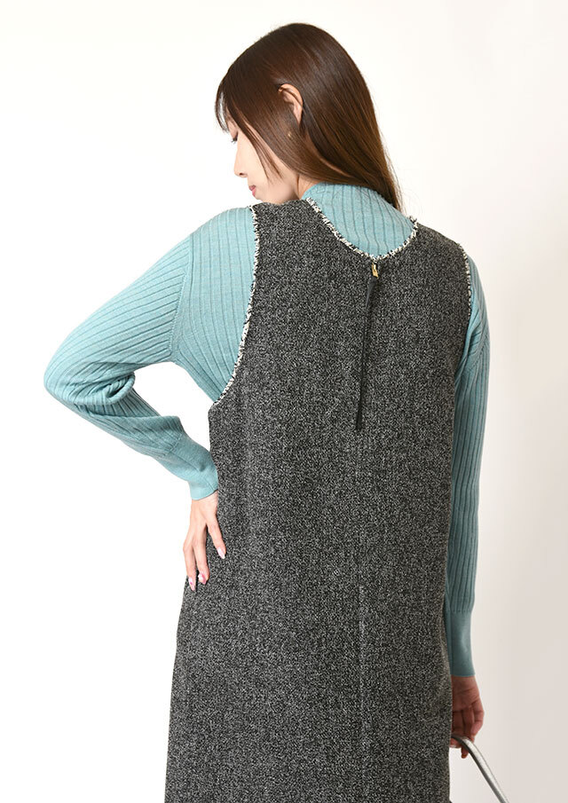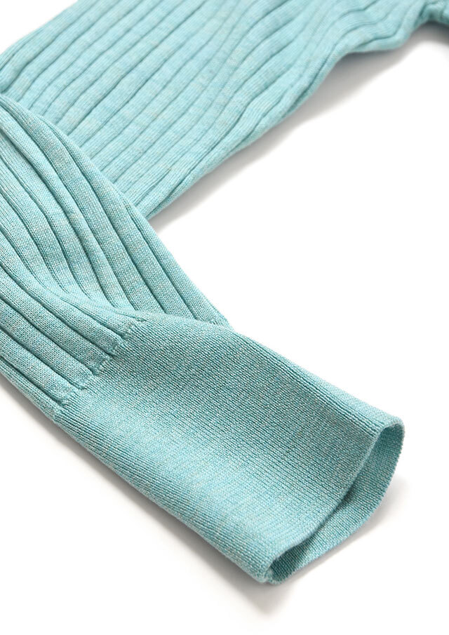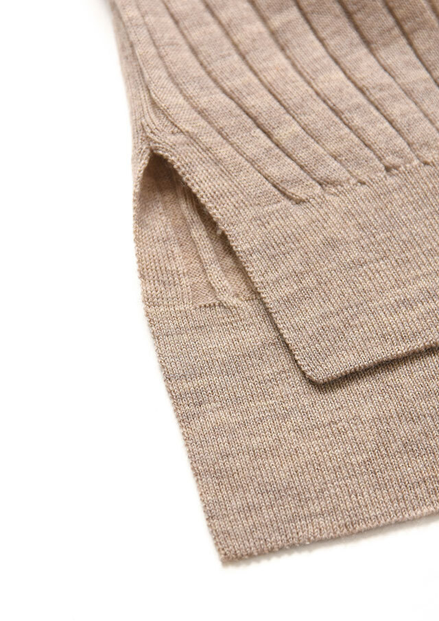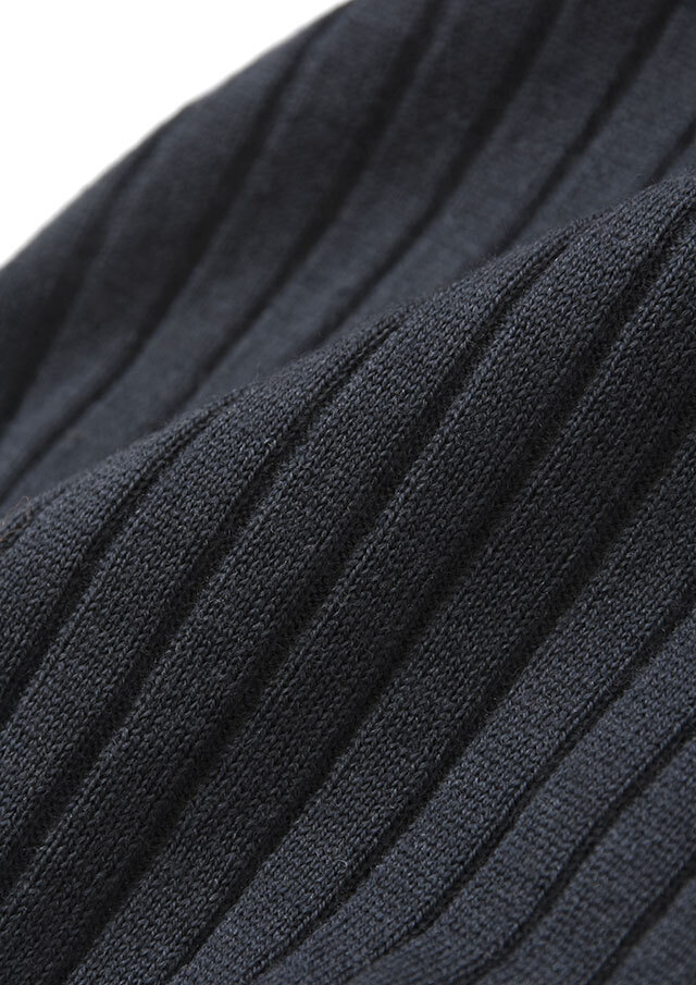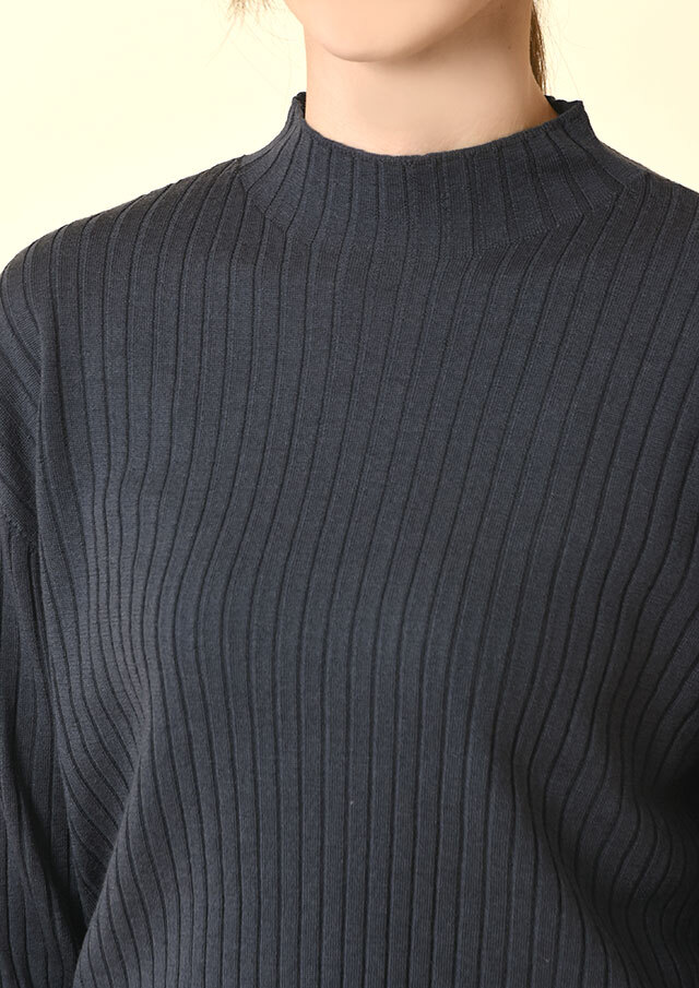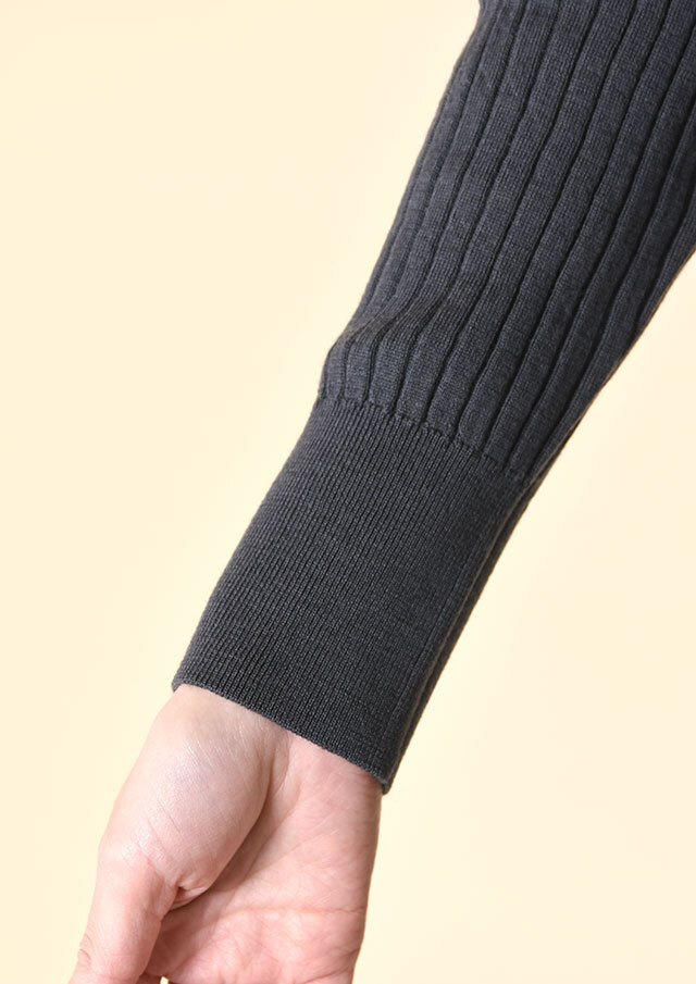 上品なリブ編みが縦のラインを強調し、シンプルでありながら凛とした雰囲気をまとえる一着です。