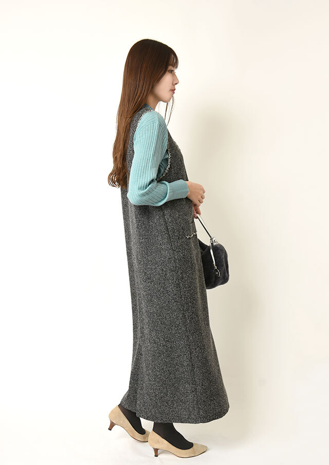 同素材のカーディガンと組み合わせれば、統一感のあるアンサンブル風の着こなしも楽しめます。