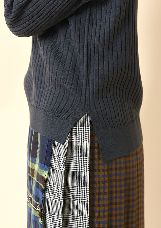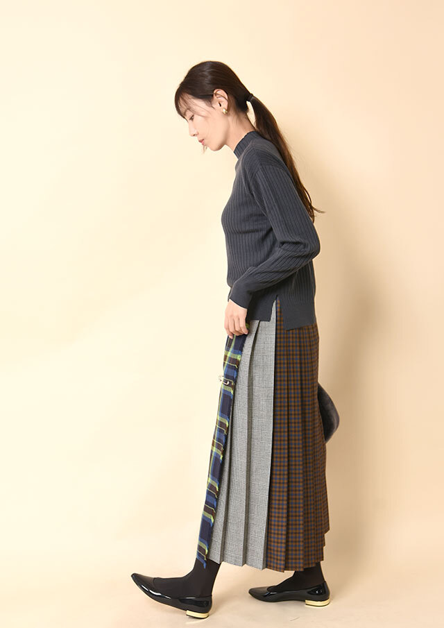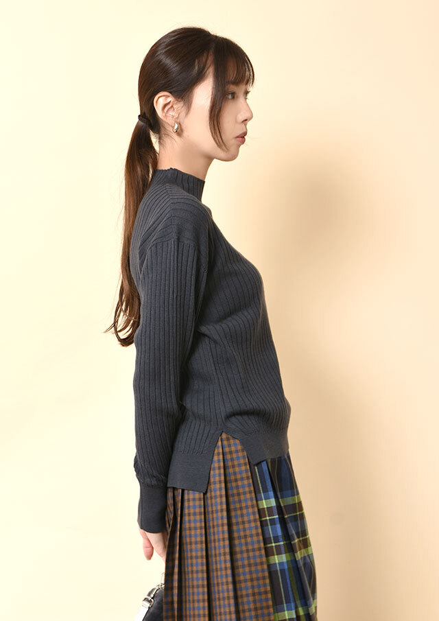 タックスカートやプリーツスカートにインして着ると、ハイネックの上品な存在感と、コンパクトすぎない身頃のバランスがちょうどよく、クラシックな雰囲気に。
