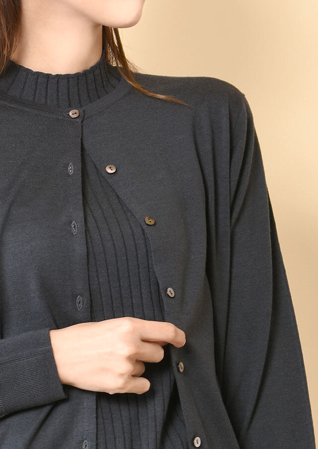 肌あたりのやわらかい素材なので、カーディガンを重ねるレイヤードスタイルも快適で、同素材のカーディガンを重ねれば、統一感のある落ち着いたスタイルに仕上がります。