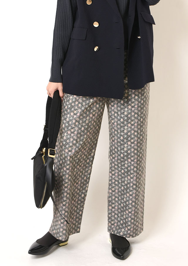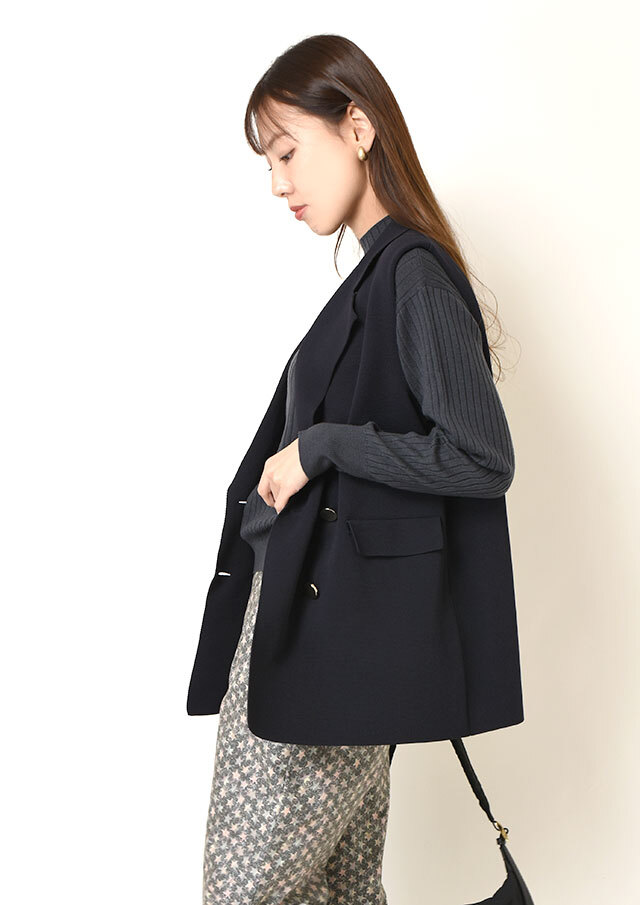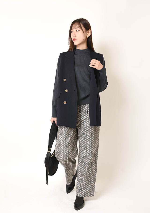 ワイドパンツに合わせると、首元のハイネックと縦に走るリブの効果でバランス良くまとまり、品良く落ち着いた印象に。
