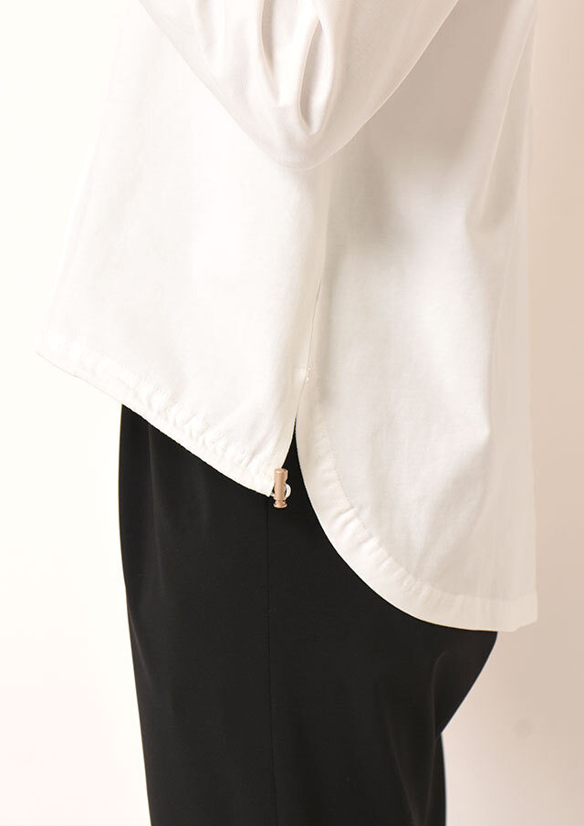 前後差のある着丈で、アウトスタイルでも自然にサマになるバランスに。