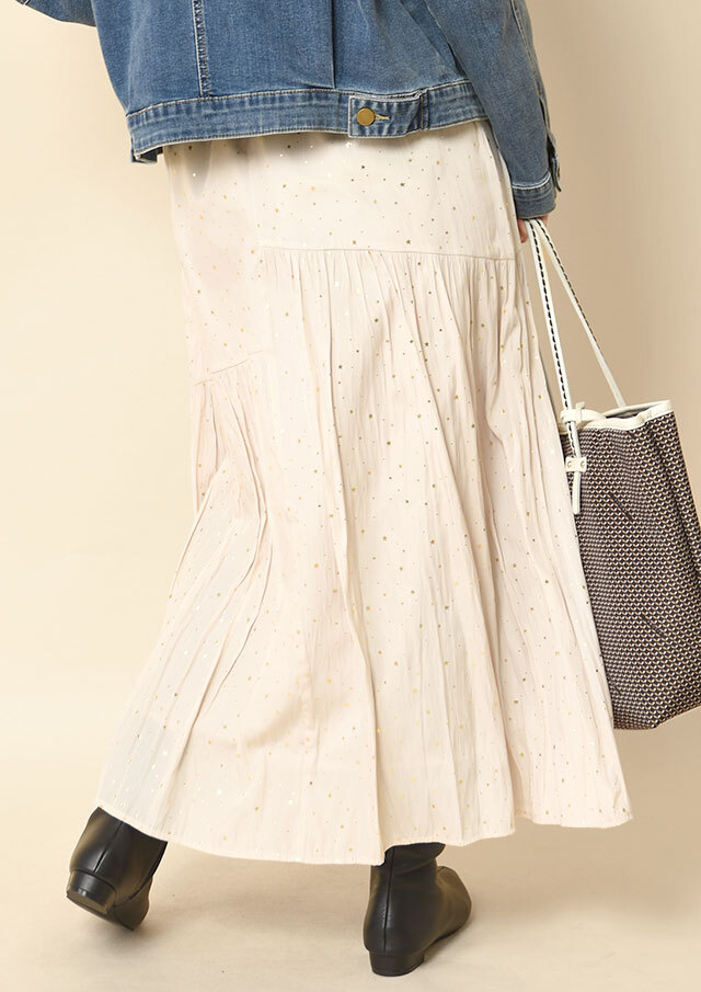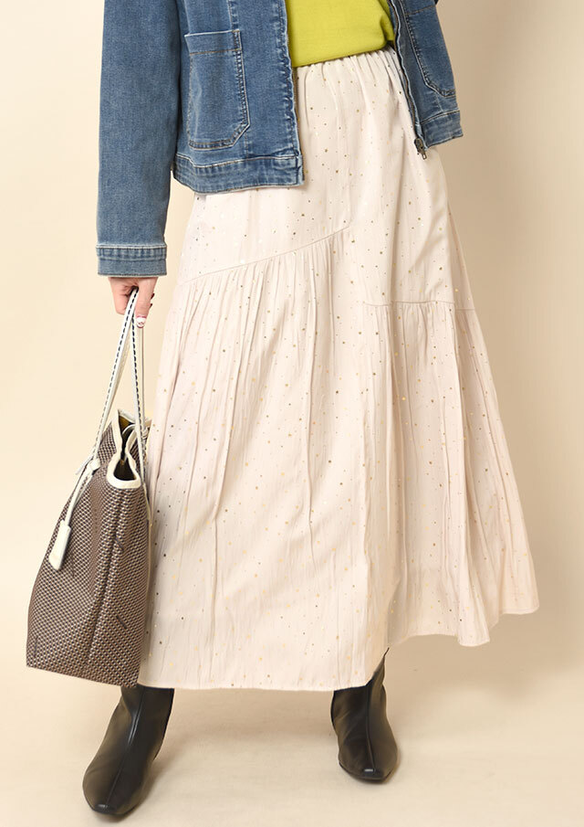 裾にかけてやさしく広がる切り替えギャザーが目を惹くスカート。
