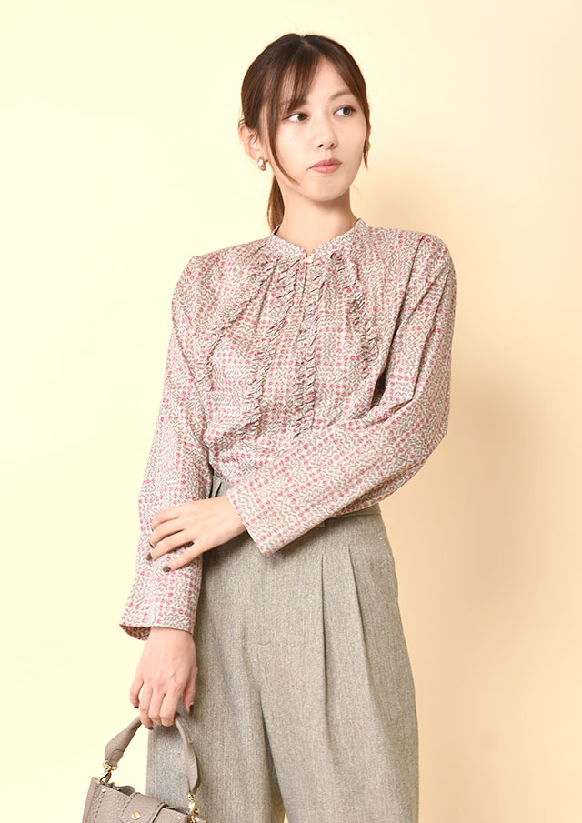 ノーカラーのスッキリとしたシルエットで、首元をスマートに演出。