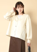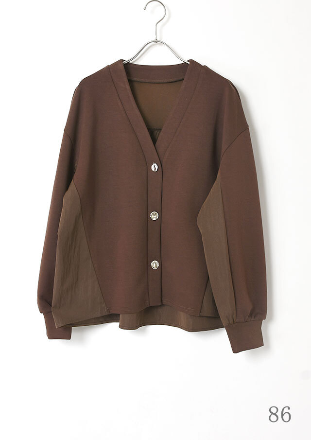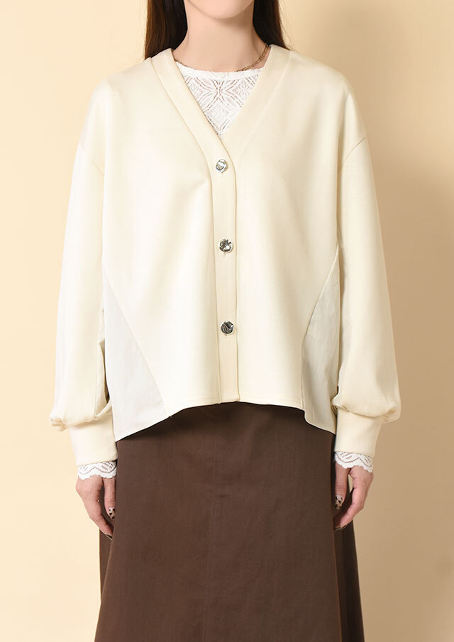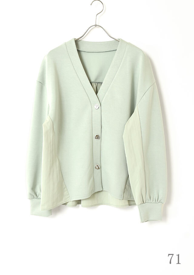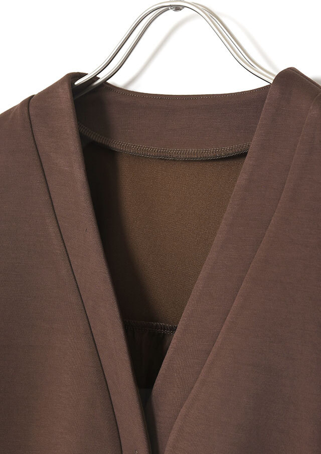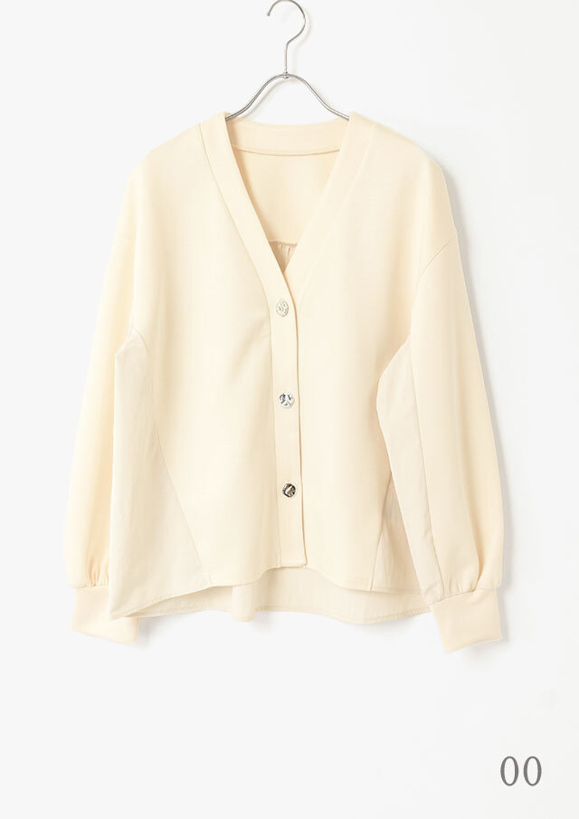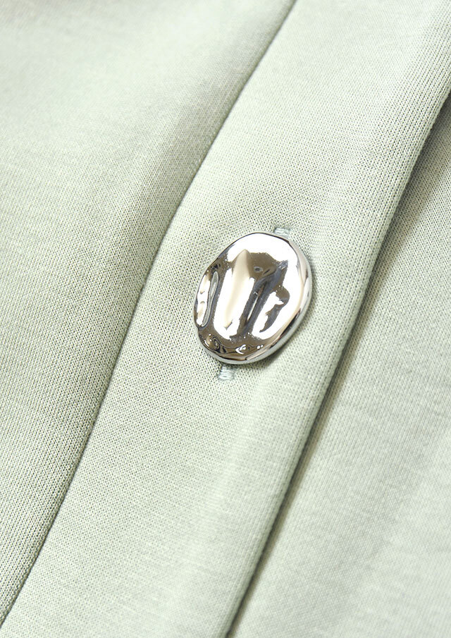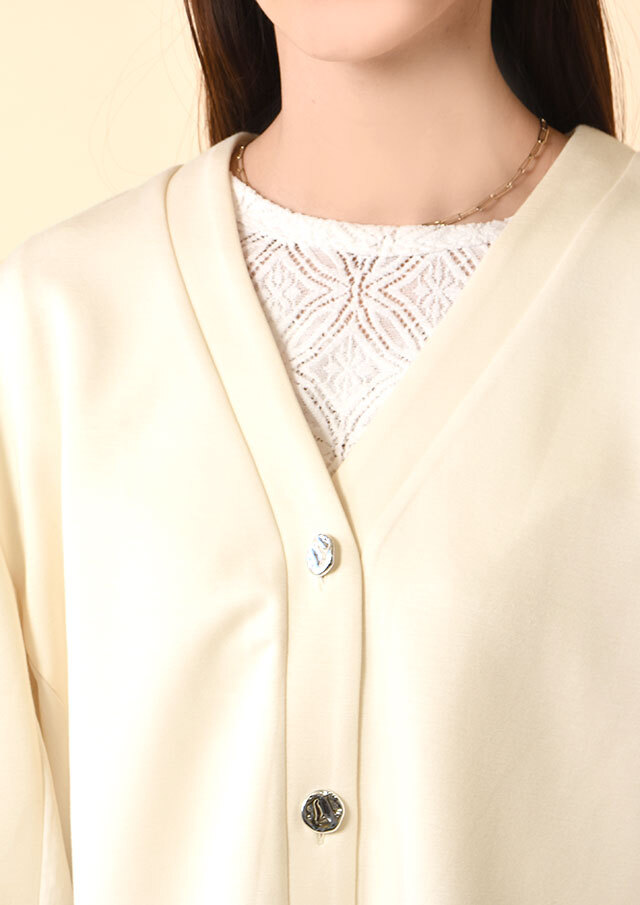 Vネックのスッキリとしたフロントに、シルバーのデザインボタンが程よいアクセント。