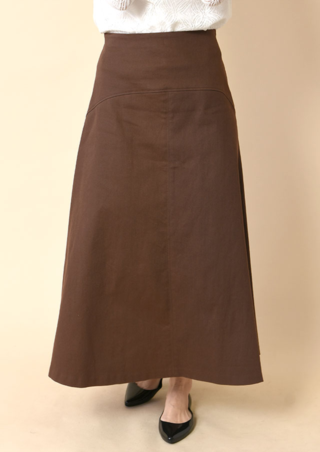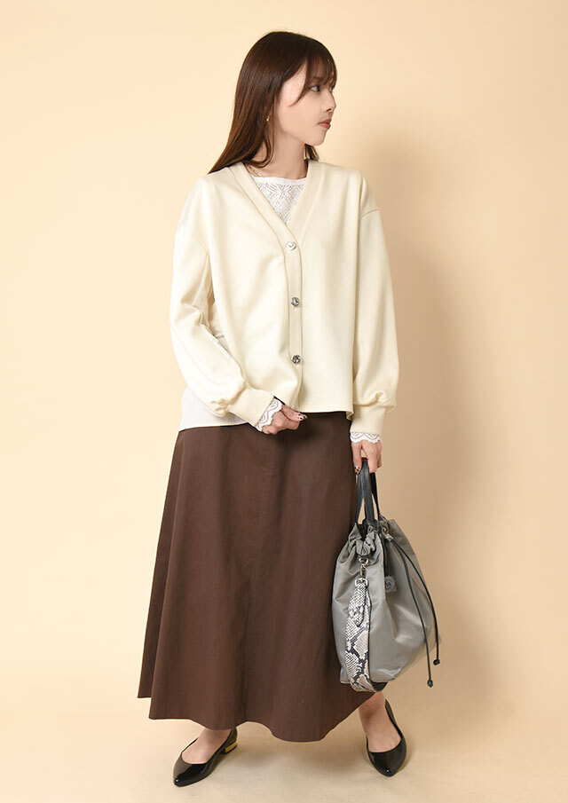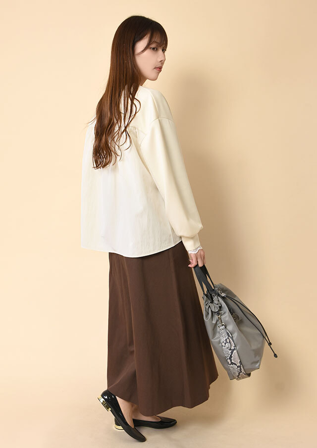 逆に、落ち感のあるスカートを合わせれば、やわらかさと構築感のバランスが心地いい印象に。