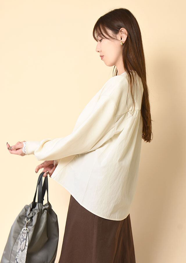 その切り替えが前身頃にも斜めにのぞき、動いたときに表情が生まれるのもポイントです。
