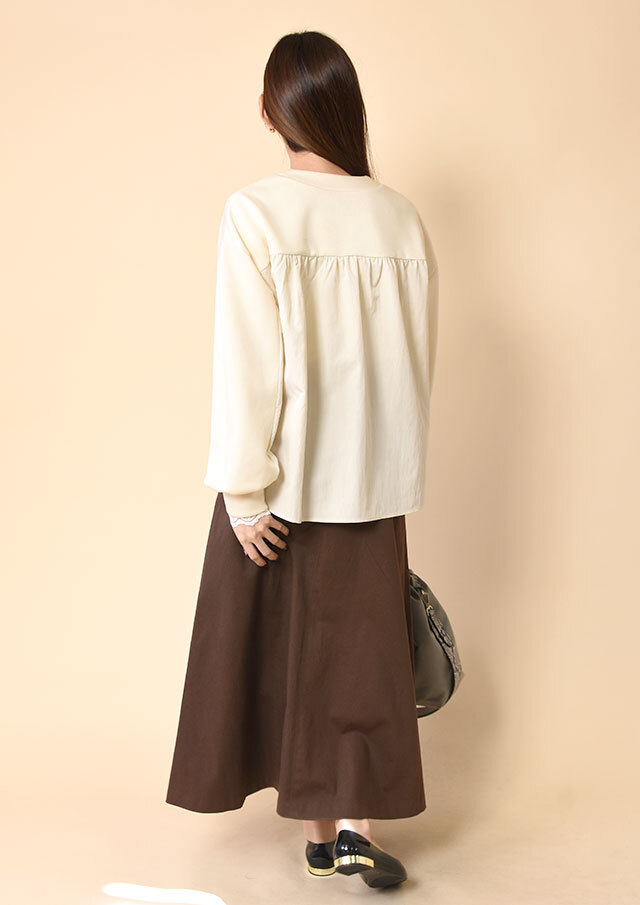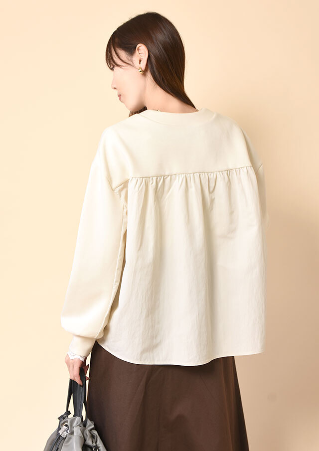 バックヨークから袖にかけて切り替えた布帛が、後ろ姿にさりげない存在感をプラス。