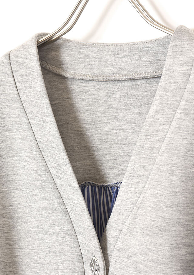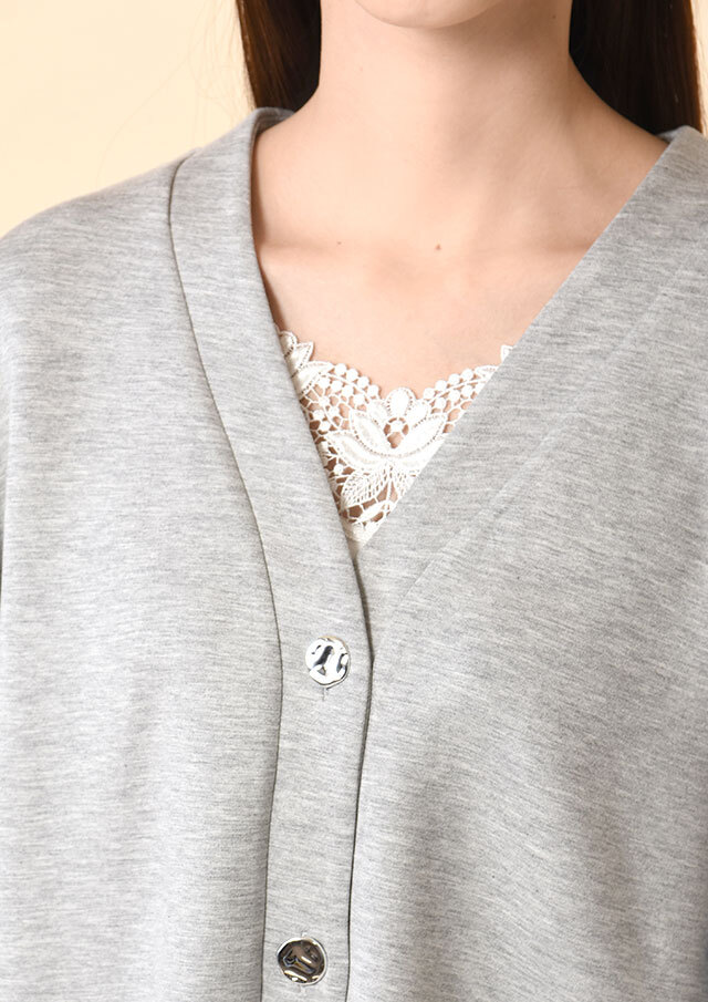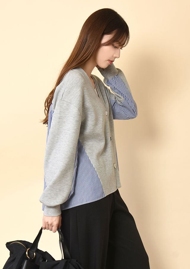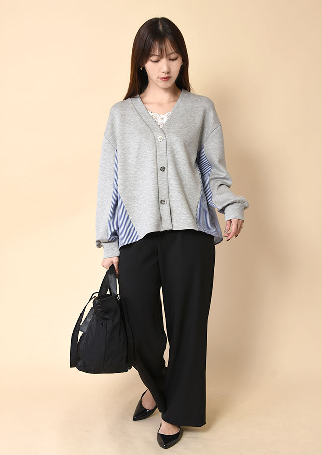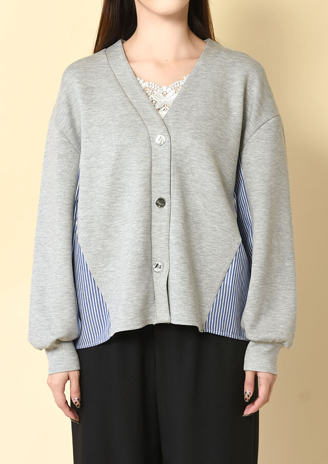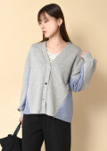 Vネックラインが顔まわりをスッキリ見せてくれる異素材コンビカーディガン。