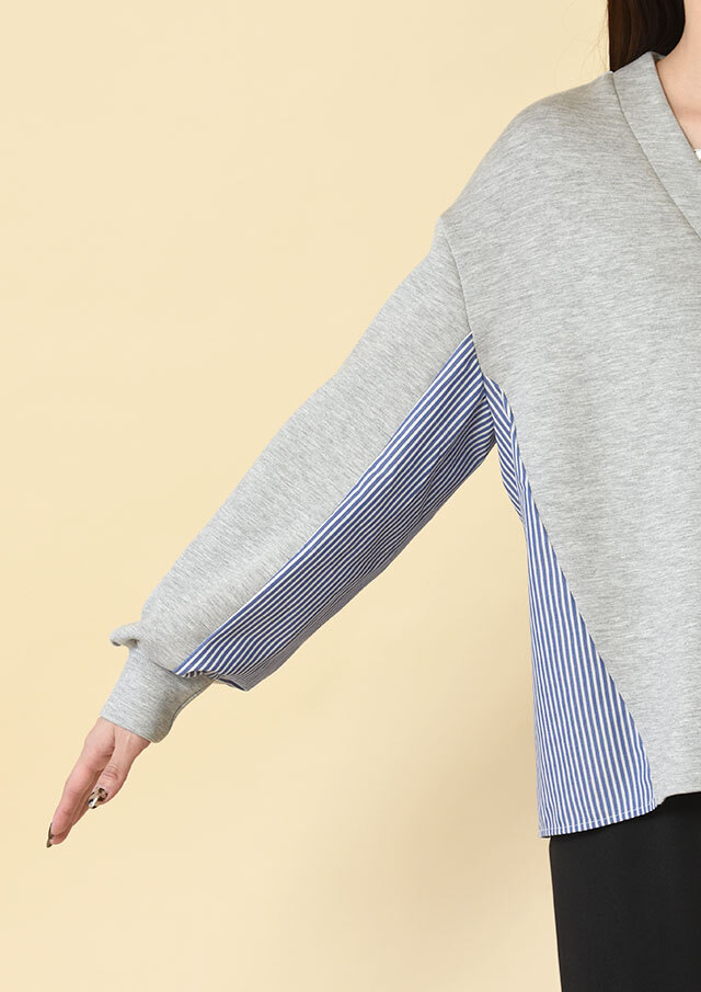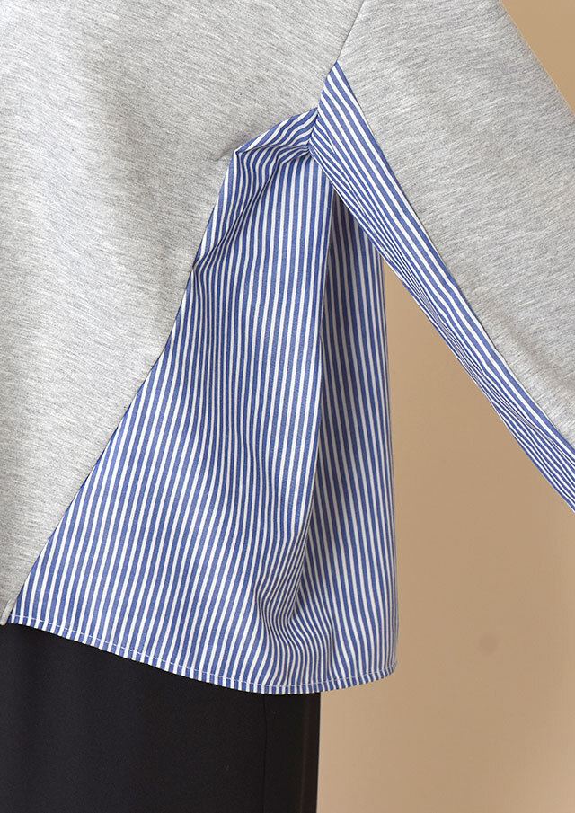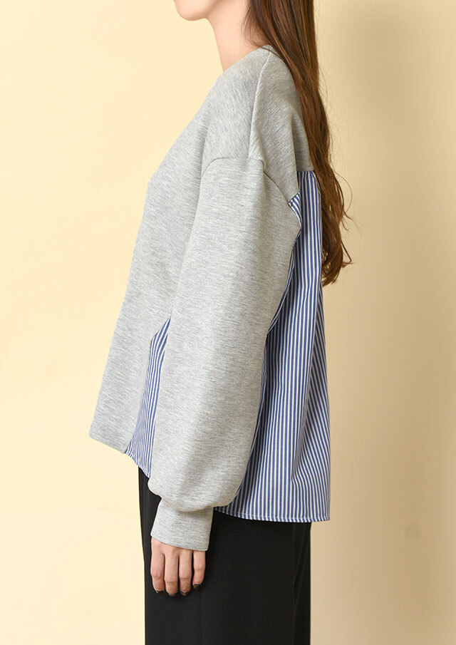 前身頃にも斜めに覗く布帛のラインが、動きのある表情を作っています。