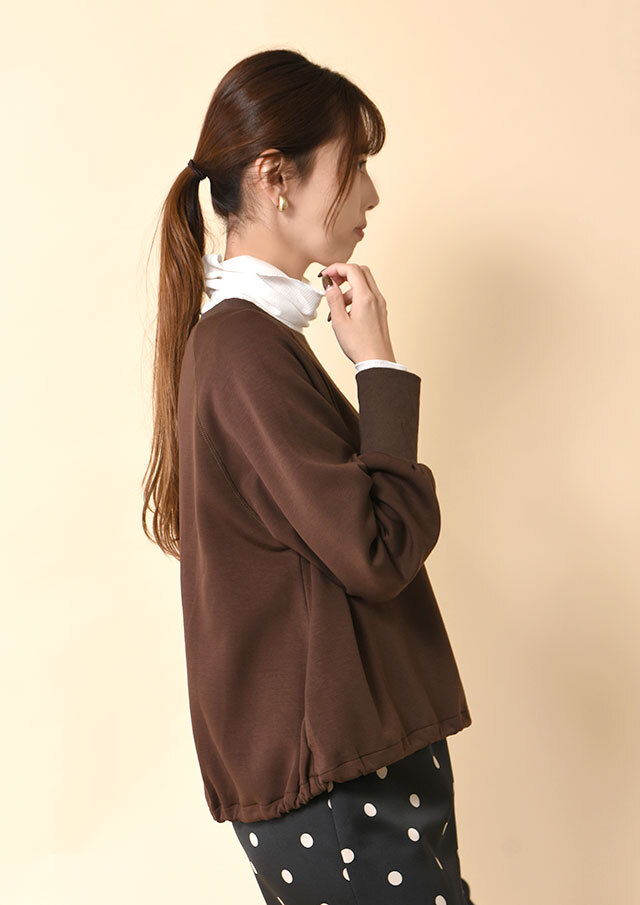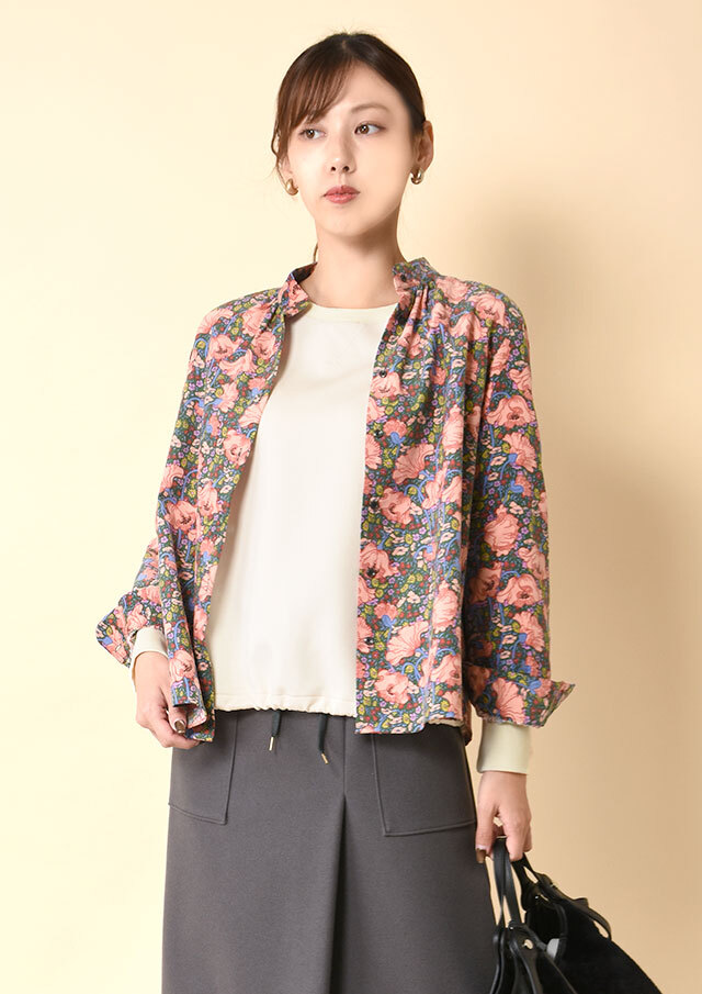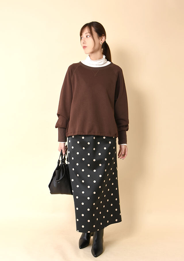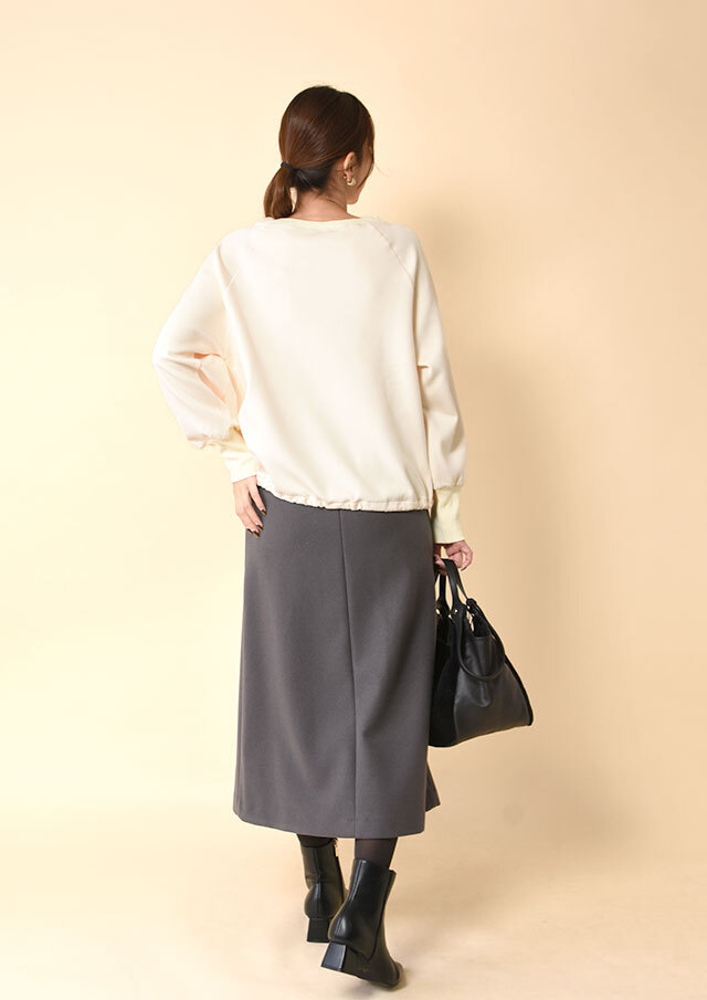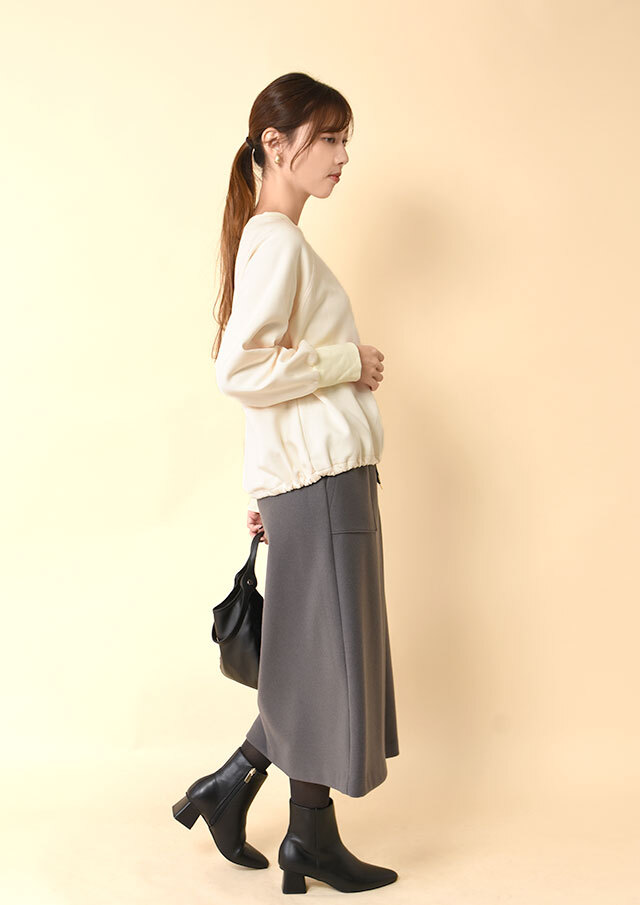 スカートと合わせる場合は、裾をふんわりまとめて立体感を出すと、上からアウターを羽織ってもバランス良く収まります。