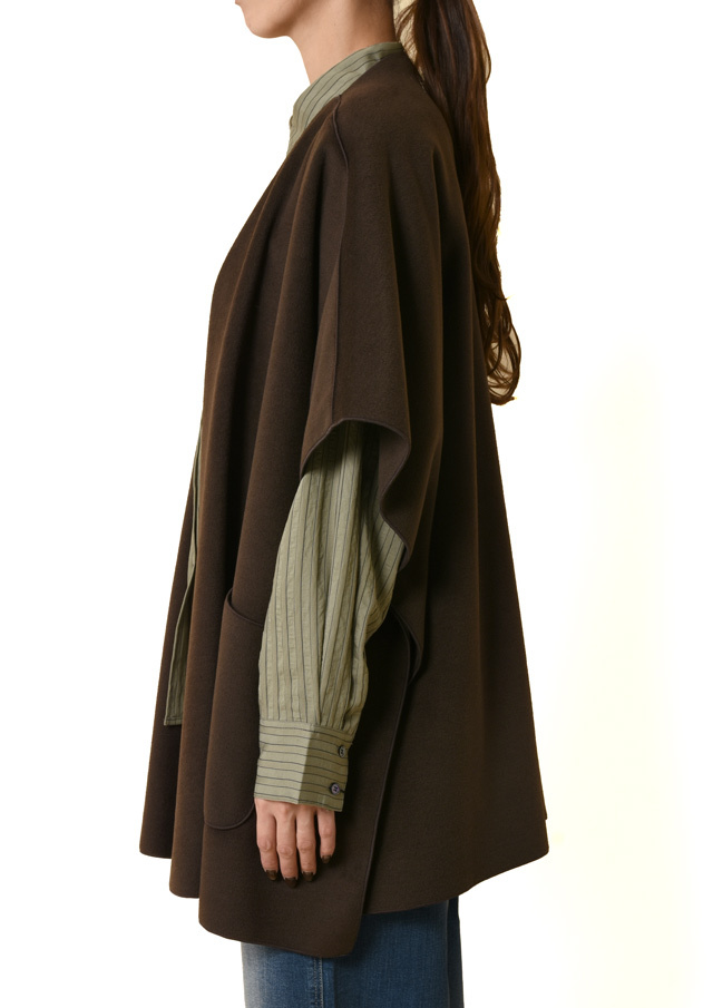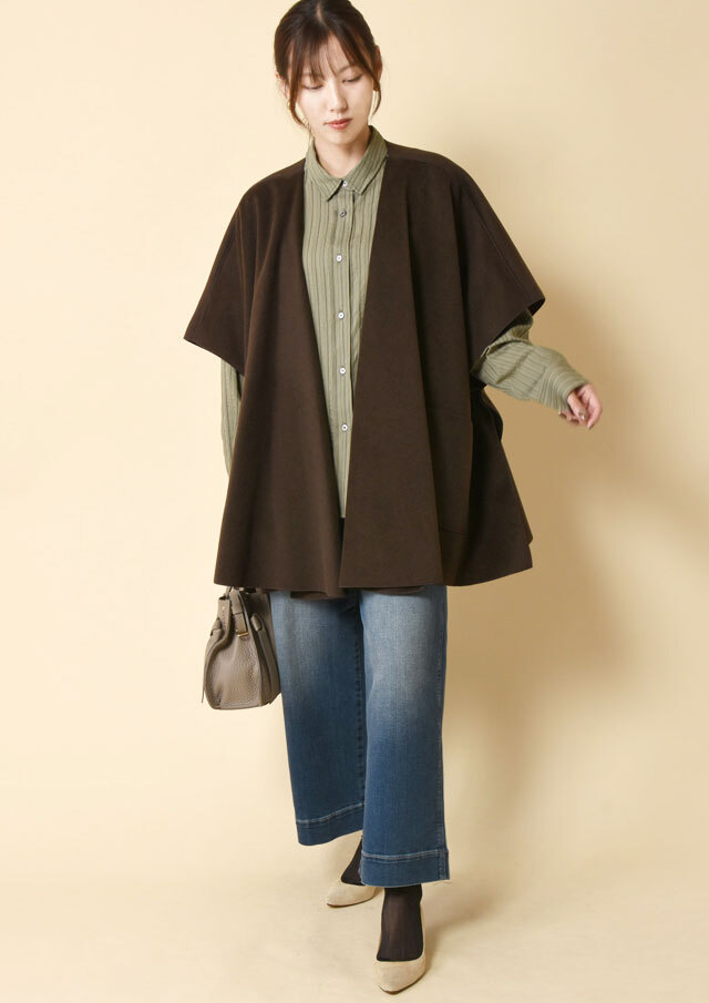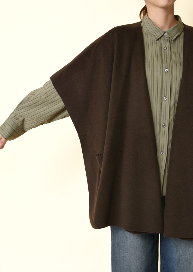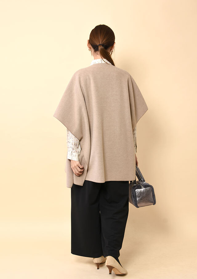 ショールのようなドレープ感と、ポンチョのような包み込むシルエットを合わせた羽織り。