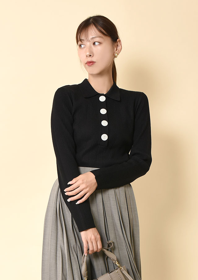 リブニットを合わせてウエストインすれば、スッキリとした縦長ラインが際立ちます。
