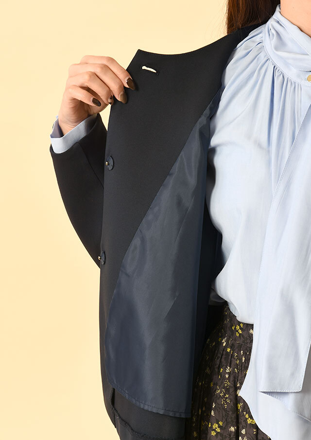 ポケットを省いたことで、全体のラインがキレイにまとまり、上品さが際立つ一着です。