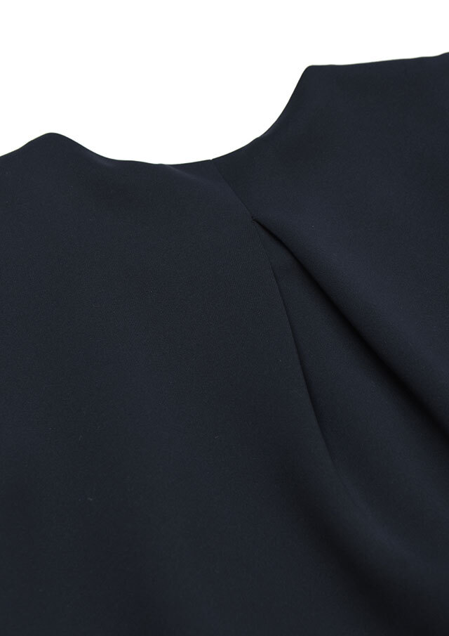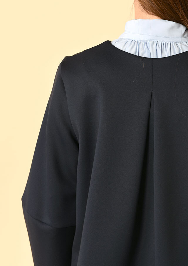 クルーネックのノーカラーデザインで、顔まわりは程よくシャープな印象に。