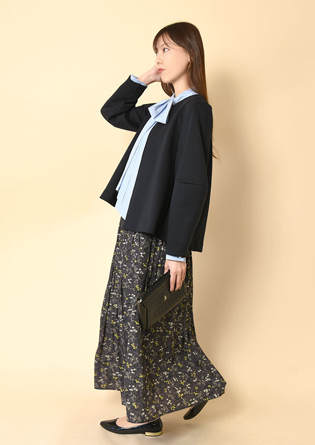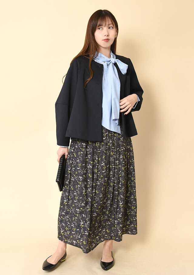 ランタンスリーブがやわらかな立体感を生み、カッチリしすぎない表情に。