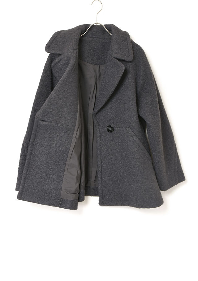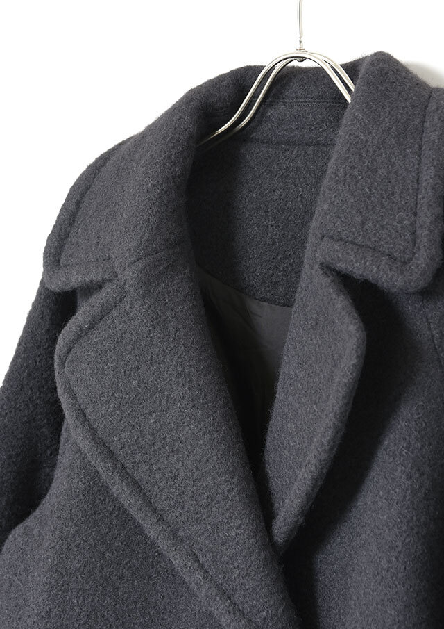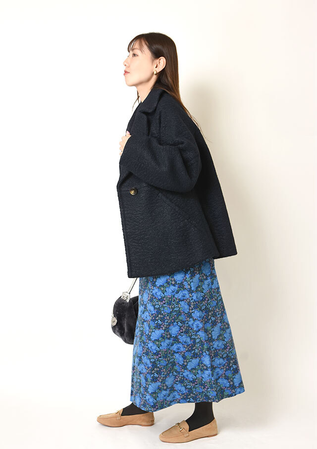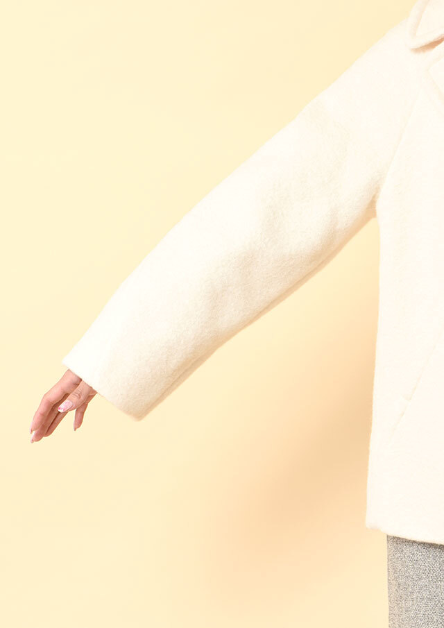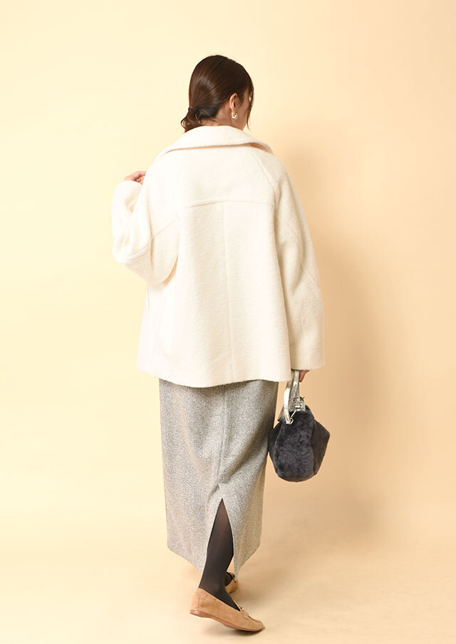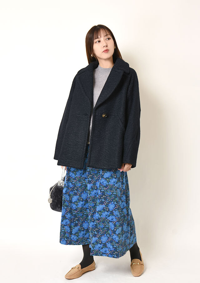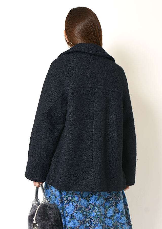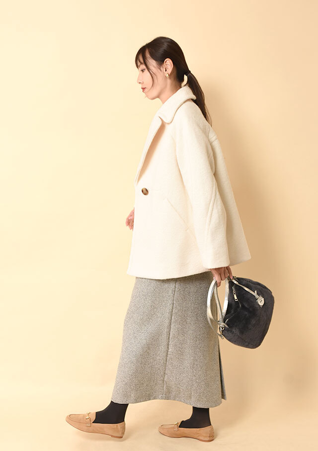 クラシックなPコート風のミドルコートは、裾にダーツを入れることで大人の女性らしいコクーンシルエットを実現。